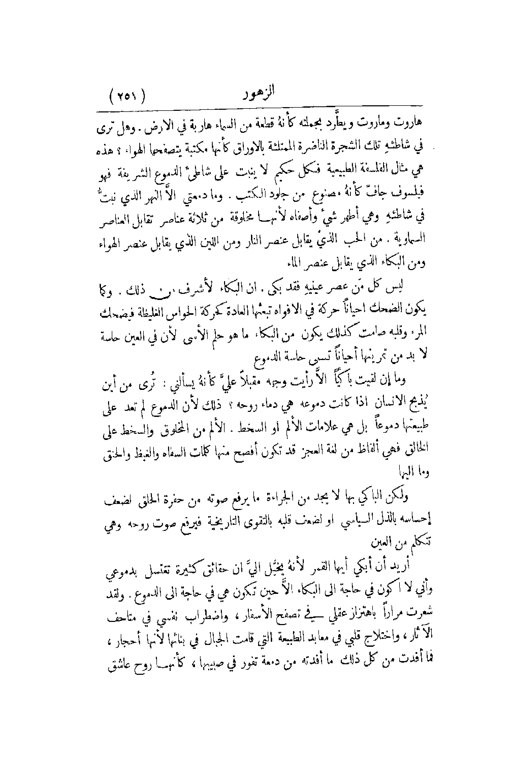 هاروت وماروت ويطَّرد بجملته كأنهُ قطعة من السماء هاربة في الأرض. وهل ترى في شاطئهِ تلك الشجرة الناضرة الممتلئة بالأوراق كأنها مكتبة يتصفحها الهواء؟ هذه هي مثال الفلسفة الطبيعية فكل حكيم لا ينبت على شاطئ الدموع الشريفة فهو فيلسوف جافّ كأنهُ مصنوع من جلود الكتب. وما دمعتي إلاَّ النهر الذي نبتُّ في شاطئهِ وهي شيء وأصفاه لأنها مخلوقة من ثلاثة عناصر تقابل العناصر السماوية. من الحب الذي يقابل عنصر النار ومن اللين الذي يقابل عنصر الهواء ومن البكاء الذي يقابل عنصر الماء. ليس كل مَن عصر عينيهِ فقد بكى. إن البكاء لأشرف من ذلك. وكما يكون الضحك أحياناً حركة في الأفواه تبعثها العادة كحركة الحواس الغليظة فيضحك المرء وقلبه صامت كذلك يكون من البكاء ما هو حلم الأسى لأن في العين حاسة لا بد من تمرينها أحياناً تسمى حاسة الدموع. وما إن لقيت باكياً إلأَّ رأيت وجهه مقبلاً عليَّ كأنهُ يسألني: تُرى من أين يُذبح الإنسان إذا كانت دموعه هي دماء روحه؟ ذلك لأن الدموع لم تعد على طبيعتها دموعاً بل هي علامات الألم أو السخط. الألم من المخلوق والسخط على الخالق فهي ألفاظ من لغة العجز قد تكون أفصح منها كلمات السفاه والغيظ والحنق وما إليها. ولكن الباكي بها لا يجد من الجراءة ما يرفع صوته من حفرة الحلق لضعف إحساسه بالذل السياسي أو لضعف قلبه بالتقوى التاريخية فيرفع صوت روحه وهي تتكلم من العين. أريد أن أبكي أيها القمر لأنهُ يخيَّل إليَّ أن حقائق كثيرة تغتسل بدموعي وأني لا أكون في حاجة إلى البكاء إلاَّ حين تكون هي في حاجة إلى الدموع. ولقد شعرت مراراً باهتزاز عقلي في تصفح الأسفار , واضطراب نفسي في متاحف الآثار , واختلاج قلبي في معابد الطبيعة التي قامت الجبال في بنائها لأنها أحجار , فما أفدت من كل ذلك ما أفدته من دمعة تفور في صبيبها , كأنها روح عاشق