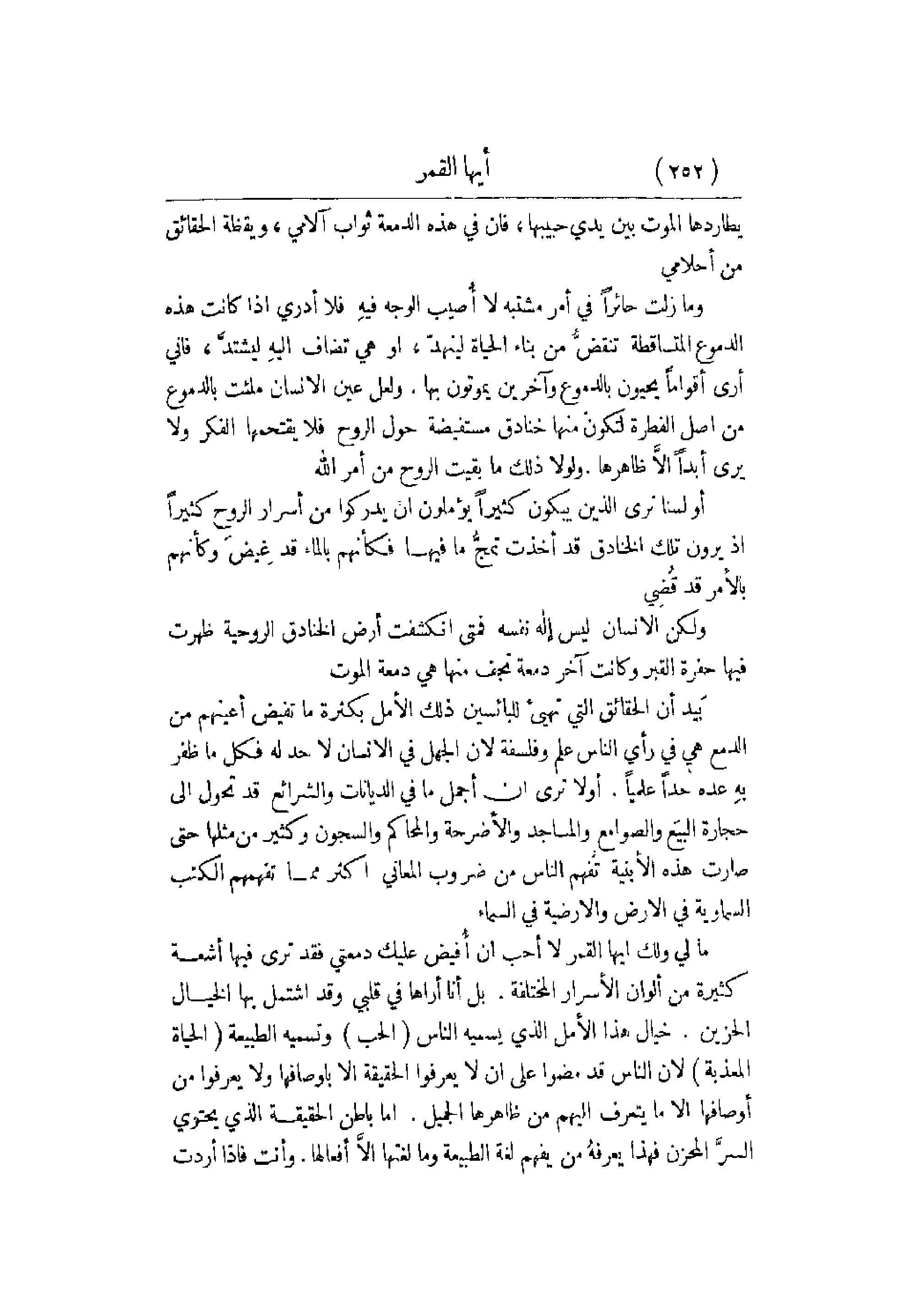 فيهِ فلا أدري إذا كانت هذه الدموع المتساقطة تنقضُّ من بناء الحياة لينهدّ , أو هي تضاف إليهِ ليشتدَّ , فإني أرى أقواماً يحبون بالدموع وآخرين يموتون بها. ولعل عين الإنسان ملئت بالدموع من أصل الفطرة لتكون منها خنادق مستفيضة حول الروح فلا يقتحمها الفكر ولا يرى أبداً إلاَّ ظاهرها ولولا ذلك ما بقيت الروح من أمر الله. أو لسنا نرى الذين يبكون كثيراً يؤملون أن يدركوا من أسرار الروح كثيراً إذ يرون تلك الخنادق قد أخذت تمجُّ ما فيها فكأنهم بالماء قد غِيض وكأنهم بالأمر قد قُضِي. ولكن الإنسان ليس إله نفسه فمتى انكشفت أرض الخنادق الروحية ظهرت فيها حفرة القبر وكانت آخر دمعة تجف منها هي دمعة الموت. بَيد أن الحقائق التي تهيئ للبائسين ذلك الأمل بكثرة ما تفيض أعينهم من الدمع هي في رأي الناس علم وفلسفة لأن الجهل في الإنسان لا حد له فكل ما ظفر بهِ عده حداً علمياً. أولا ترى أن أجمل ما في الديانات والشرائع قد تحول إلى حجارة البيَع والصوامع والمساجد والأضرحة والمحاكم والسجون وكثير من مثلها حتى صارت هذه الأبنية تفهم الناس من ضروب المعاني أكثر مما تفهمهم الكتب السماوية في الأرض والأرضية في السماء. ما لي ولك أيها القمر لا أحب أن أُفيض عليك دمعتي فقد ترى فيها أشعة كثيرة من ألوان الأسرار المحتلفة. بل أنا أراها في قلبي وقد اشتمل بها الخيال الحزين. خيال هذا الأمل الذي يسميه الناس الحب وتسمية الطبيعة الحياة المعذبة لأن الناس قد مضوا على أن لا يعرفوا الحقيقة إلا بأوصافها ولا يعرفوا من أوصافها إلا ما يتعرف إليهم من ظاهرها الجميل. أما باطن الحقيقة الذي يحتوي السرَّ المحزن فهذا يعرفهُ من يفهم لغة الطبيعة وما لغتها إلاَّ أفعالها. وأنت فإذا أردت