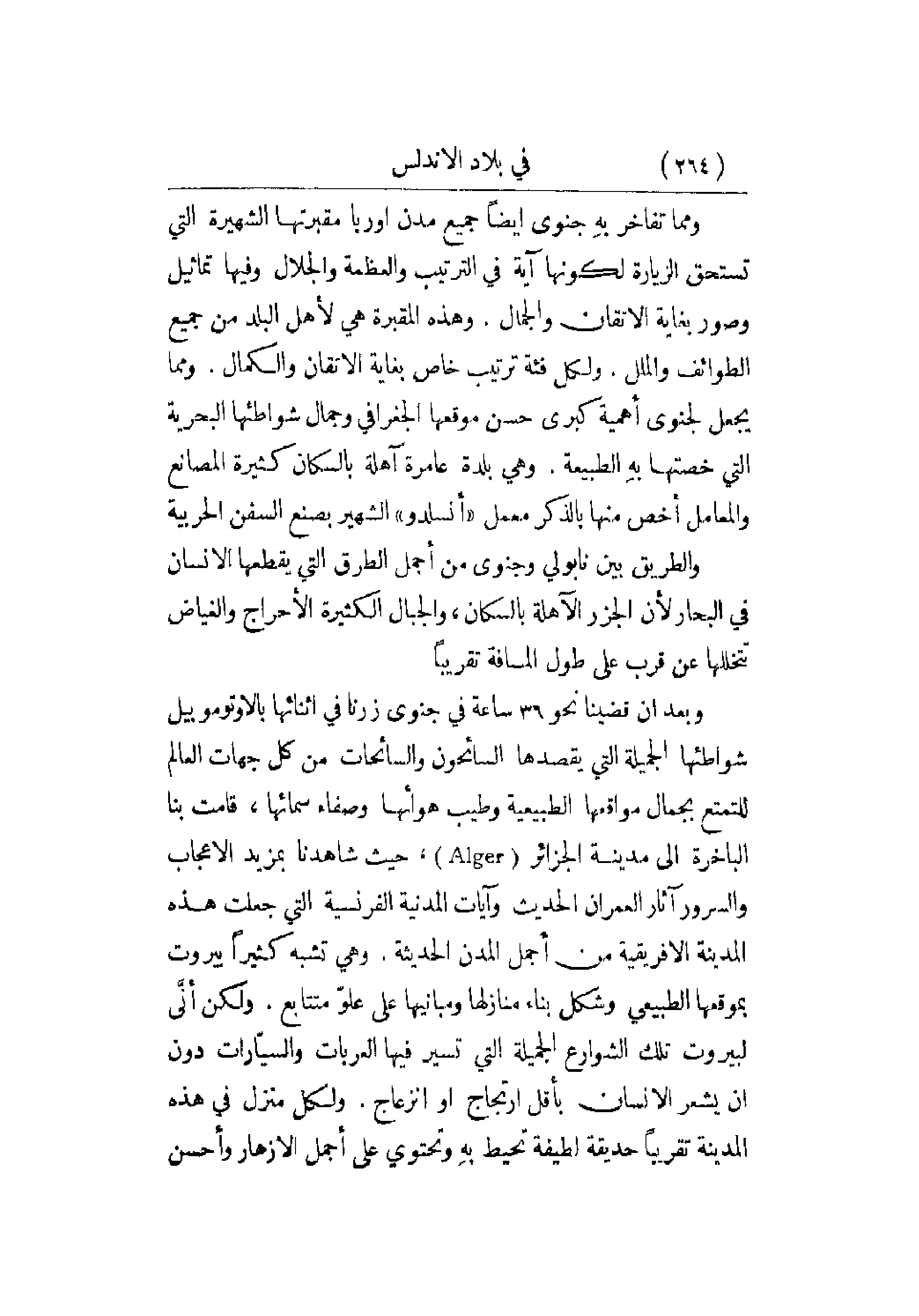 الفرنسية التي جعلت هذه المدينة الإفريقية من أجمل المدن منازلها ومبانيها على علوّ متتابع. ولكن أنَّى لبيروت تلك الشوارع الجميلة التي تسير فيها العربات والسيّارات دون أن يشعر الإنسان بأقل ارتجاج أو انزعاج. ولكل منزل في هذه المدينة تقريباً حديقة لطيفة بهِ وتحتوي على أجمل الإزهار وأحسن