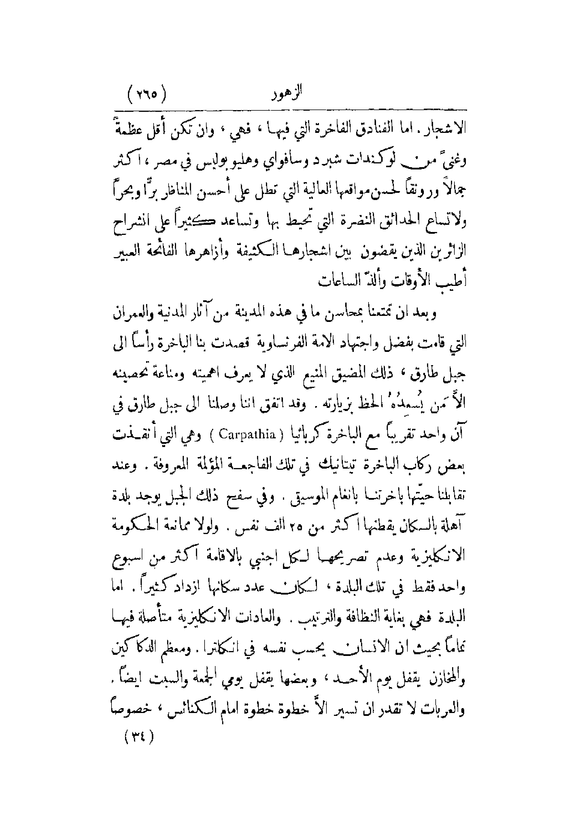 الأشجار. أما الفنادق الفاخرة التي فيها , فهي , وإن تكن أقل عظمةً وغنىً من لو كندات شبرد وسافواي وهليوبوليس في مصر , أكثر جمالاً ورونقاً لحسن مواقعها العالية التي تطل على أحسن المناظر برًّا وبحراً ولاتساع الحدائق النضرة التي تحيط بها وتساعد كثيراً على انشراح الزائرين الذين يقضون بين أشجارها الكثيفة وأزاهرها الفائحة العبير أطيب الأوقات وألذّ الساعات. وبعد أن تمتعنا بمحاسن ما في هذه المدينة من ىثار المدينة والعمران التي قامت بفضل واجتهاد الأمة الفرنساوية قصدت بنا الباخرة رأساً إلى جبل طارق , ذلك المضيق المنيع الذي لا يعرف أهميته ومناعة تحصينه إلاَّ مَن يُسعدُهُ الحظ بزيارته. وقد اتفق أننا وصلنا إلى جبل طارق في آن واحد تقريباً مع الباخرة كرباثيا وهي التي أنقذت بعض ركاب الباخرة تيتانيك في تلك الفاجعة المؤلمة المعروفة. وعند تقابلنا حيّتها باخرتنا بأنغام الموسيقى. وفي سفح ذلك الجبل يوجد بلدة آهلة بالسكان يقطنها أكثر من 25 ألف نفس. ولولا ممانعة الحكومة الإِنكليزية وعدم تصريحها لكل أجنبي بالإقامة أكثر من أسبوع واحد فقط تلك البلدة , لكان عدد سكانها ازداد كثيراً. أما البلدة فهي بغاية النظافة والترتيب. والعادات الإنكليزية متأصلة فيها تماماً بحيث أن الإنسان يحسب نفسه في انكلترا. ومعظم الدكاكين والمخازن يقفل يوم الأحد , وبعضها يقفل يومي الجمعة والسبت أيضاً. والعربات لا تقدران تسير إلاَّ خطوة خطوة أمام الكنائس , خصوصاً