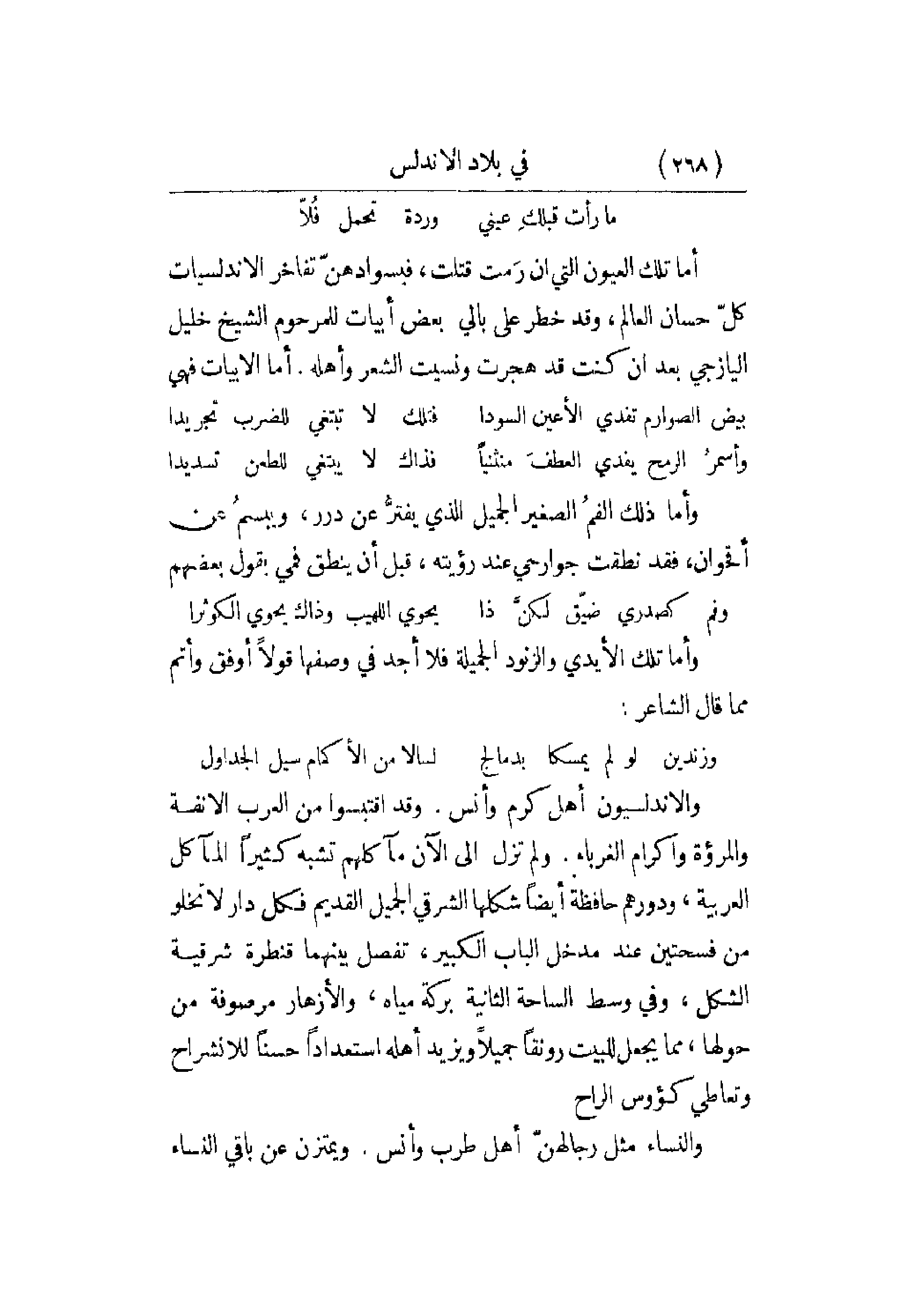 أما تلك العيون التي أن رَمت قتلت , فبسوادهنّ تفاخر الأندلسيات كلّ حسان العالم , وقد خطر على بالي بعض أبيات للمرحوم الشيخ خليل اليازجي بعد أن كنت قد هجرت ونسيت الشعر وأهله. أما الأبيات فهي: