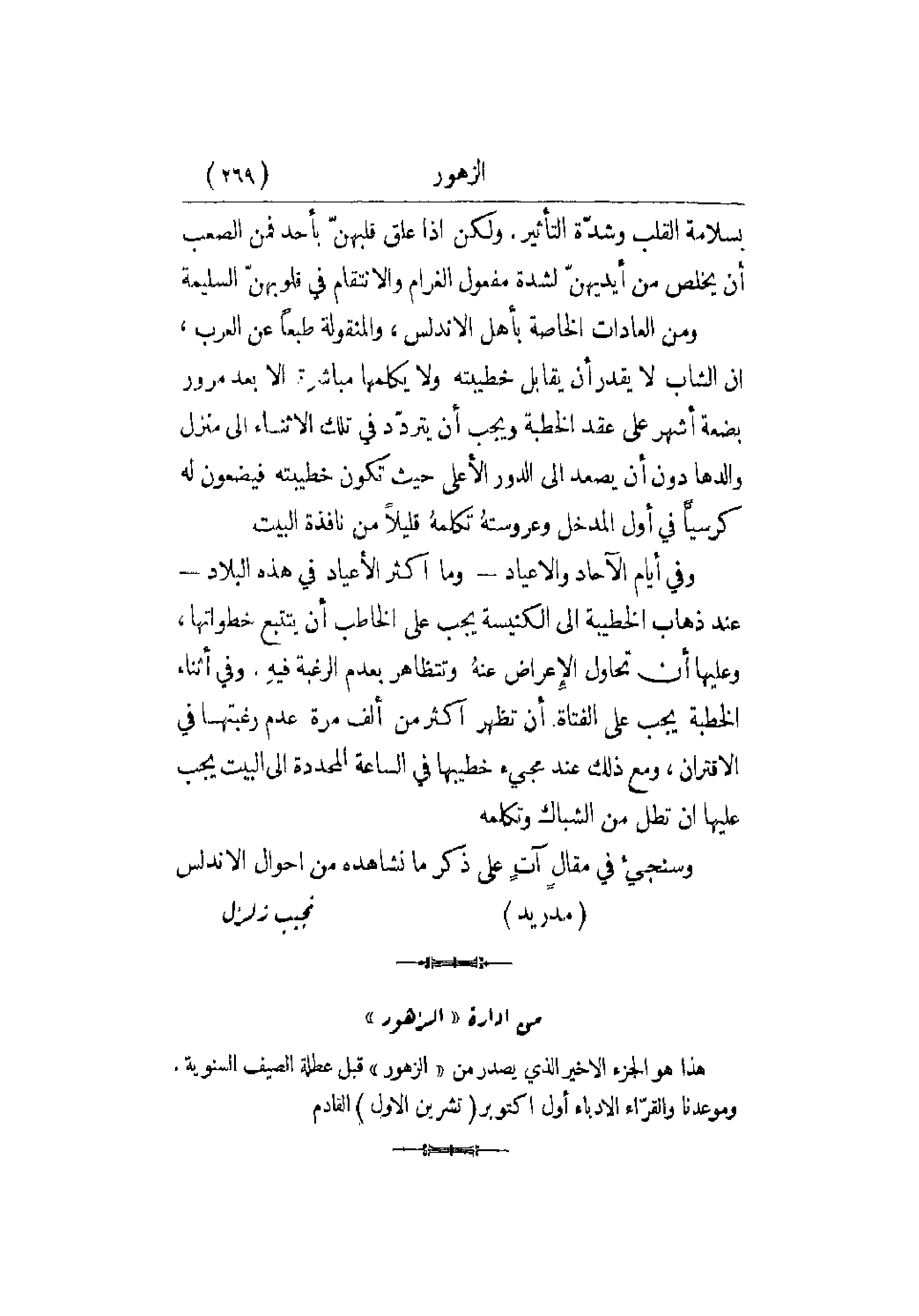 بسلامة القلب وشدّة التأثير. ولكن إذا علق قلبهنّ بأحد فمن الصعب أن يخلص من أيديهنّ لشدة مفعول الغرام والانتقام في قلوبهنّ السليمة. ومن العادات الخاصة بأهل الأندلس , والمنقوطة طبعاً عن العرب , إن الشاب لا يقدر أن يقابل خطيبته ولا يكلمها مباشرة إلا بعد مرور بضعة أشهر على عقد الخطبة ويجب أن يتردّد في تلك الأثناء إلى منزل والدها دون أن يصعد إلى الدور الأعلى حيث تكون خطيبته فيضعون له كرسيّاً في أول المدخل وعروستهُ تكلمهُ قليلاً من نافذة البيت. وفي أيام الآحاد والأعياد - وما أكثر الأعياد في هذه البلاد - عند ذهاب الخطيبة إلى الكنيسة يجب على الخاطب أن يتتبع خطواتها , وعليها أن تحاول الإِعراض عنهُ وتتظاهر بعدم الرغبة فيهِ. وفي أثناء الخطبة يجب على الفتاة أن تظهر أكثر من ألف