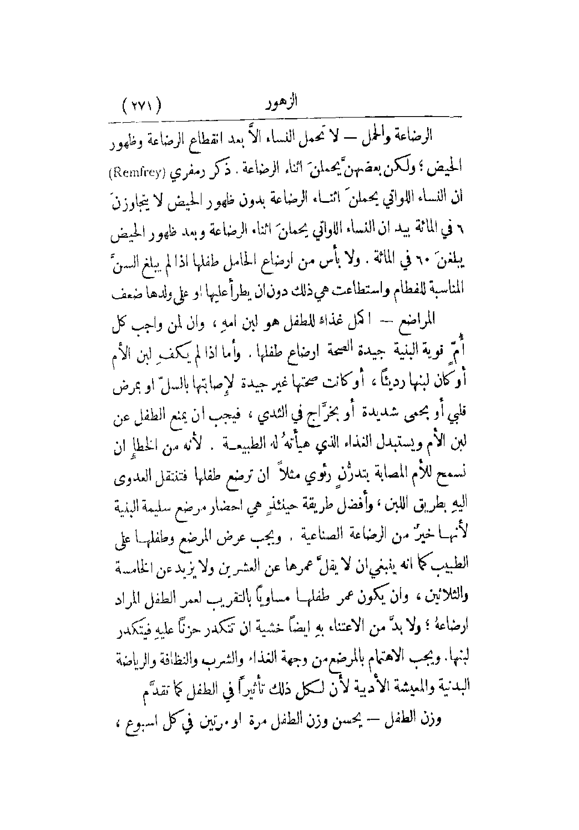 المراضع - أكمل غذاءٍ للطفل هو لبن أمهِ , وإن لمن واجب كل أُمٍّ قوية البنية جيدة الصحة إرضاع طفلها. وأما إذا لم يكفِ لبن الأم أو كان لبنها رديئاً , أو كانت صحتها غير جيدة لإِصابتها بالسّ أو بمرض قلبي أو بحمى شديدة أو بخرَّاج في الثدري , فيجب أن يمنع الطفل عن لبن الأم ويستبدل الغذاء الذي هيأتهُ له الطبيعة. لأنه من الخطأِ أن نسمح للأم المصابة بتدرُّنٍ رئوي مثلاً أن ترضع طفلها فتنتقل العدوى إليهِ بطريق اللبن ,