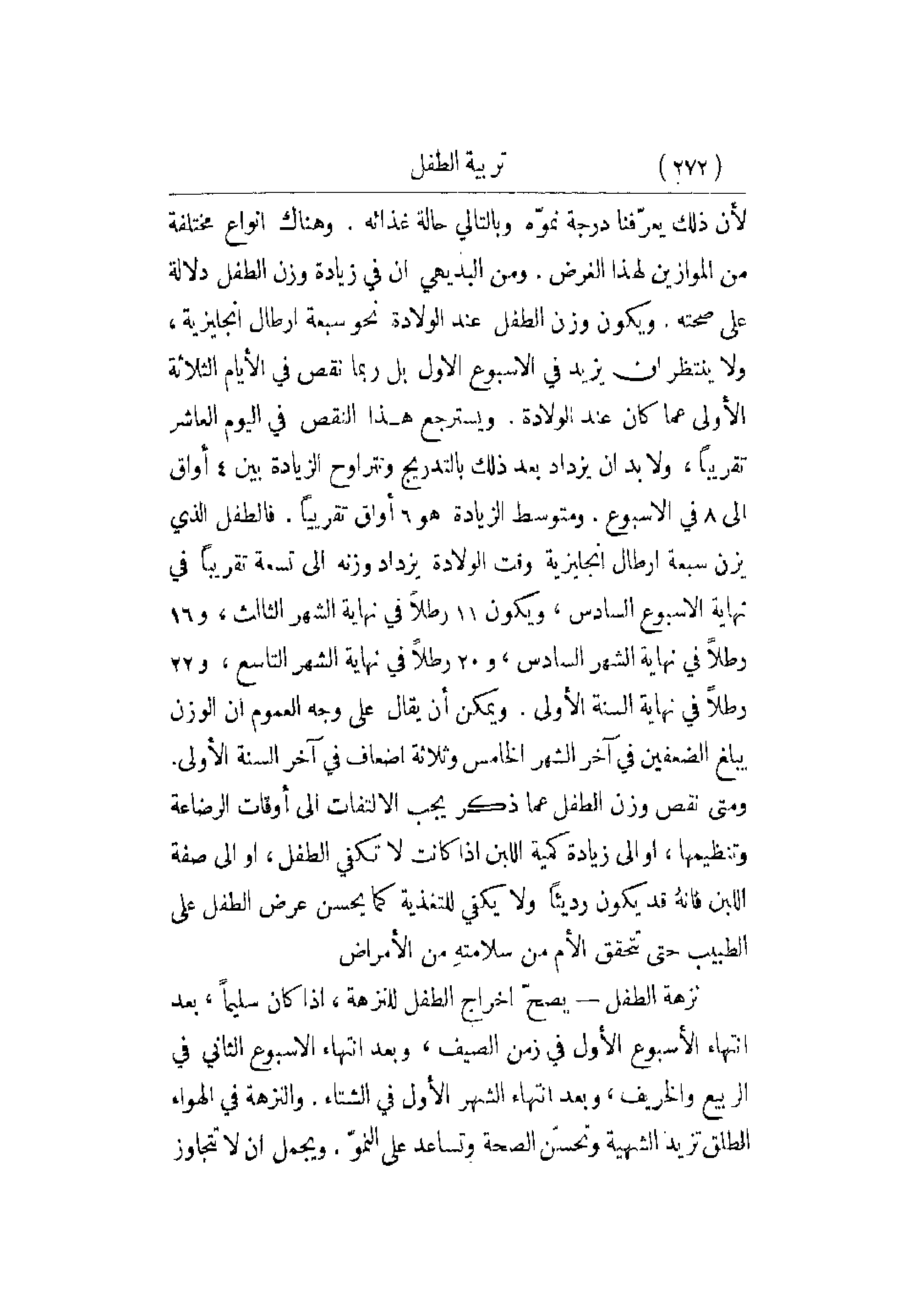 لأن ذلك يعّفنا درجة نموّه وبالتاي حالة غذائه. وهناك أنواع مختلفة من الموازين لهذا الغرض. ومن البديهي أن في زيادة وزن الطفل دلالة على صحته. ويكون وزن الطفل عند الولادة نحو سبعة أرطال انجليزية , ولا ينتظر أن يزيد في الأسبوع الأول بل ربما نقص في الأيام الثلاثة الأولى عما كان عند الولادة. ويسترجع هذا النقص في اليوم العاشر تقريباً , ولابد أن يزداد بعد ذلك بالتدريج ونتراوح الزيادة بين 4 أواق إلى 8 في الأسبوع. ومتوسط الزيادة هو 6 أواق تقريباً. فالطفل الذي يزن سبعة أرطال انجليزية وقت الولادة يزداد وزنه إلى تسعة تقريباً في نهاية الأسبوع السادس , ويكون 11 رطلاً في نهاية الشهر الثالث , 16 رطلاً في نهاية الشهر السادس , و20 رطلاً في نهاية الشهر التاسع , و22 رطلاً في نهاية السنة الأولى. ويمكن أن يقال على وجه العموم أن الوزن يبلغ الضعفين في آخر الشهر الخامس وثلاثة أضعاف في آخر السنة الأولى. ومتى نقص وزن الطفل عما ذكر يجب الالتفات إلى أوقات الرضاعة وتنظيمها , أو إلى زيادة كمية اللبن إذا كانت لا تكفي الطفل , أو إلى صفة اللبن فإنهُ فد يكون رديئاً ولا يكفي للتغذية كما يحسن عرض الطفل على الطبيب حتى تتحقق الأم من سلامتهِ من الأمراض.