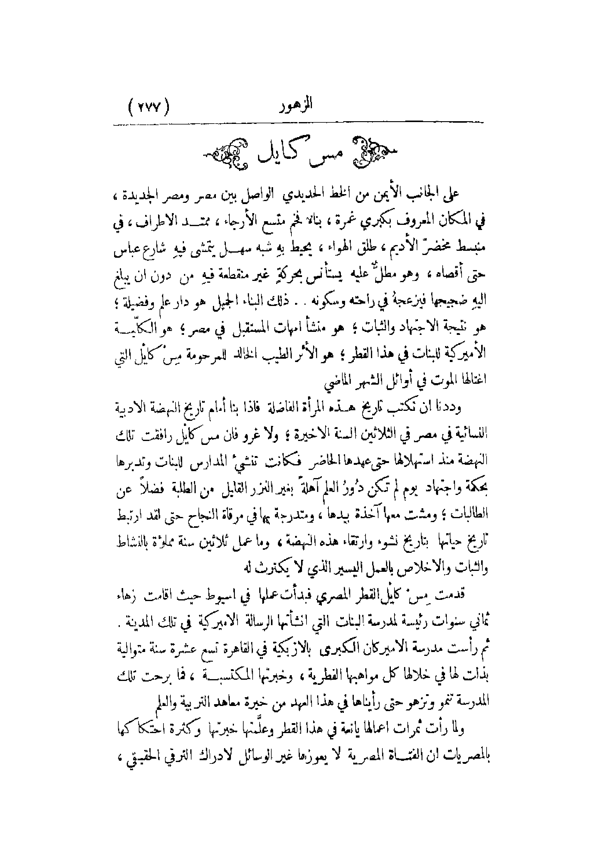 على الجانب الأيمن من الخط الحديدي الواصل بين مصر ومصر الجديدة , في المكان المعروف بكبري غمرة , بناءٌ فخم متسع الأرجاء , ممتد الأطراف , في منبسط مخضرّ الأديم , طلق الهواء , يحيط بهِ شبه سهل يتمشى فيهِ شارع عباس حتى أقصاه , وهو مطلٌّ عليه يستأنس بحركةٍ غير منقطعة فيهِ من دون أن يبلغ إليهِ ضجيجها فيزعجهُ في راحته وسكونه. . . ذلك البناء الجميل هو دار علم وفضيلة؛ هو نتيجة الاجتهاد والثبات؛ هو منشأ أمهات المستقبل في مصر؛ هو الكلّية الأميركية للبنات في هذا القطر؛ هو الأثر الطيب الخالد للمرحومة مِسْ كايْل التي اغتالها الموت في أوائل الشهر الماضي. وددنا أن نكتب تاريخ هذه المرأة الفاضلة فإذا بنا أمام تاريخ النهضة الأدبية النسائية في مصر في الثلاثين السنة الأخيرة؛ ولا غرو فإن مس كايْل رافقت تلك النهضة منذ استهلالها حتى عهدها الحاضر فكانت تنشيء المدارس للبنات وتديرها بحكمة واجتهاد يوم لم تكن دُورُ العلم آهلةً بغير النزر القليل من الطلبة فضلاً عن الطالبات؛ ومشت معها آخذة بيدها , ومتدرجة بها في مرقاة النجاح حتى لقد ارتبط تاريخ حياتها بتاريخ نشوء وارتقاء هذه النهضة , وما عمل ثلاثين سنة مملؤة بالنشاط والثبات والإخلاص بالعمل اليسير الذي لا يكترث له. قدمت مِسْ كايْل القطر المصري فبدأت عملها في اسيوط حيث أقامت زهاء ثماني سنوات رئيسية لمدرسة البنات التي أنشأتها الرسالة الأميركية في تلك المدينة. ثم رأست مدرسة الأميركان الكبرى بالأزبكية في القاهرة تسع عشرة سنة متوالية بذلت لها في خلال كل مواهبها الفطرية , وخبرتها المكتسبة , فما برحت تلك المدرسة تنمو وتزهو حتى رأيناها في هذا العهد من خيرة معاهد التربية والعلم. ولما رأت ثمرات أعمالها يانعة في هذا القطر وعلَّمتها خبرتها وكثرة احتكاكها بالمصريات أن الفتاة المصرية لا يعوزها غير الوسائل لإدراك الترقي الحقيقي ,