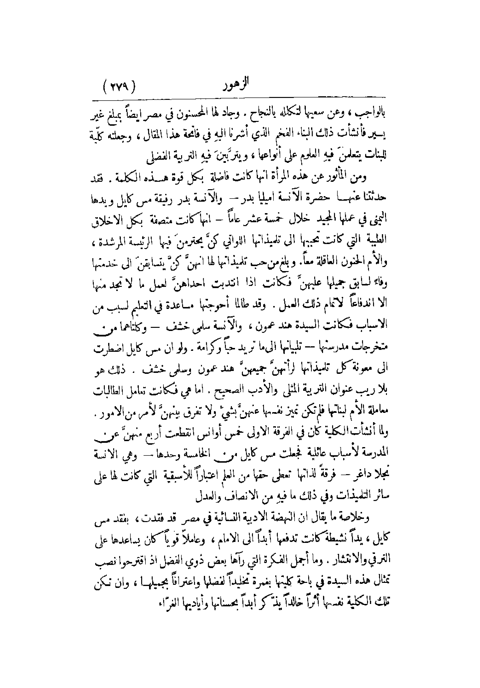 وعن سعيها لتكلله بالنجاح. وجاد لها المحسنون في مصر أيضاً بمبلغ غير يسير فأنشأت ذلك البناء الفخم الذي أشرنا إليهِ في فاتحة هذا المقال , وجعلته كلّية للبنات يتعلمنَ فيهِ العلوم على أنواعها , ويترَّبينَ فيهِ التربية الفضلى. ومن المأثور عن هذه المرأة أنها كانت فاضلة بكل قوة هذه الكلمة. فقد حدثتنا عنها حضرة الآنسة اميليل بدر - والآنسة بدر رفيقة مس كايل ويدها اليمنى في عملها المجيد خلال خمسة عشر عاماً - أنها كانت متصفة بكل الأخلاق الطيبة التي أنت تحببها إلى تلميذاتها اللواتي كنَّ يحترمنَ فيها الرئيسة المرشدة , والأم الحنون العاقلة معاً. وبلغ من حب تلميذاتها لها أنهنَّ كنَّ يتسابقنَ إلى خدمتها وفاءً لسابق جميلها عليهنَّ فكانت إذا انتدبت إحداهنَّ لعمل ما لا تجد منها إلا اندفاعاً لإتمام ذلك العمل.