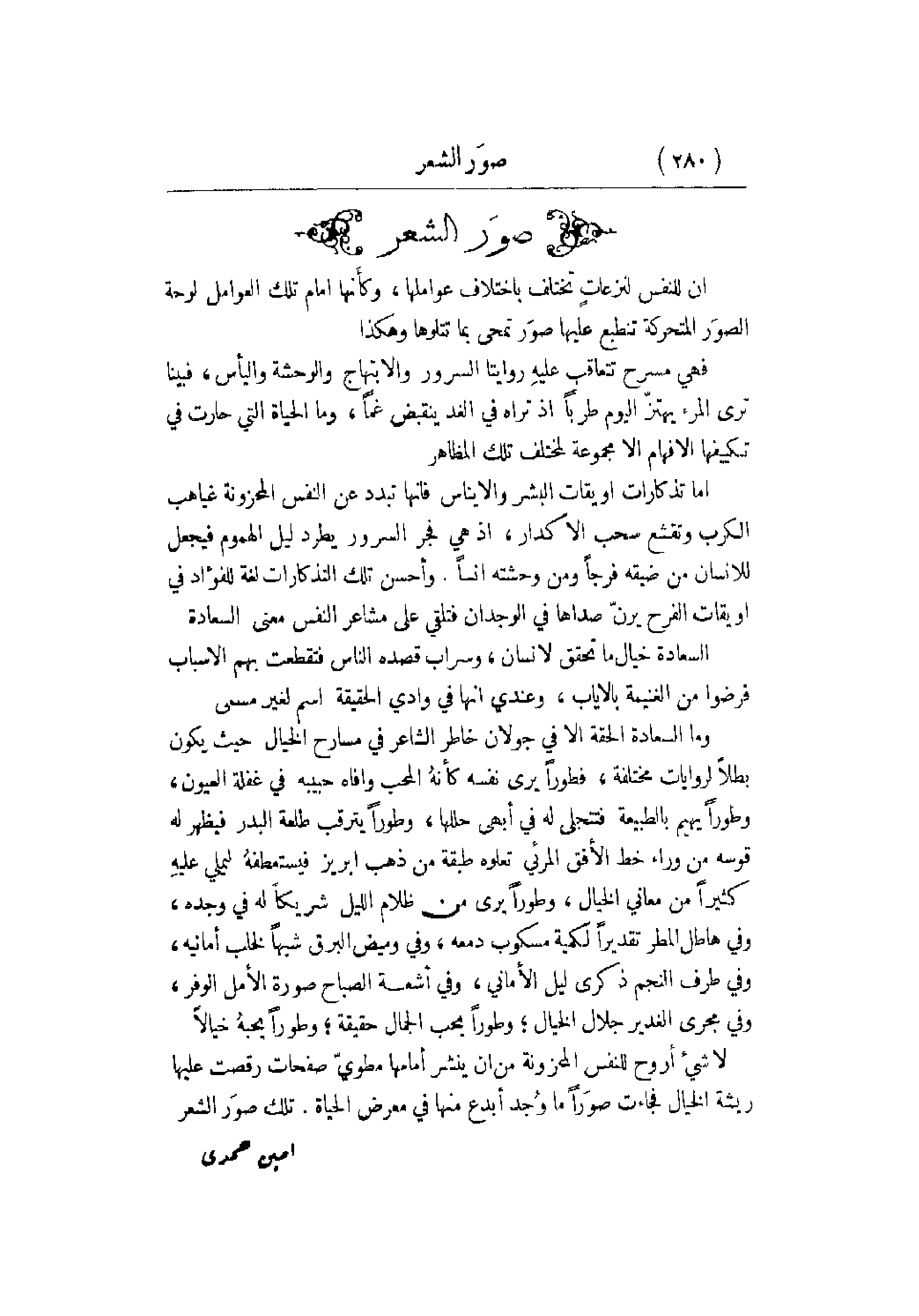 إن للنفس لنزعات تختلف باختلاف عواملها , وكأنها أمام تلك العوامل لوحة الصوَر المتحركة تنطبع عليها صوَر بما تتلوها وهكذا. فهي مسرح تتعاقب عليهِ روايتنا السرور والابتهاج والوحشة واليأس , فبينا ترى المرء يهتز اليوم طرباً إذ تراه في الغد ينقبض غماً , وما الحياة التي حارت في تكييفها الإفهام إلا مجموعة لمختلف تلك المظاهر. أما تذكارات أويقات البشر والإيناس فإنها تبدد عن النفس المحزونة غياهب الكرب وتقشع سحب الاكدار , إذ هي فجر السرور يطرد ليل الهموم فيجعل للإنسان من ضيقه فرجاً ومن وحشته أنساً. وأحسن تلك التذكارات لغة للفؤاد في أويقات الفرح يرنّ صداها في الوجدان فتلقي على مشاعر النفس معنى السعادة. السعادة خيال ما تحقق لإنسان , وسراب قصده الناس فتقطعت بهم الأسباب فرضوا من الغنيمة بالإياب , وعندي أنها في وادي الحقيقة اسم لغير مسمى. وما السعادة الحقة إلا في جولان خاطر الشاعر في مسارح الخيال حيت يكون بطلاً لروايات مختلفة , فطوراً يرى نفسه كأنهُ المحب وافاه حبيبه في غفلة العيون , وطوراً بهيم بالطبيعة فتتجلى له في أبهى حللها , وطوراً يترقب طلعة البدر فيظهر له قوسه من وراء خط الأفق المرئي تعلوه طبقة من ذهب ابريز فيستعطفهُ ليملي عليهِ كثيراً من معاني الخيال , وطوراً يرى من ظلام الليل شريكاً له في وجده , وفي هاطل المطر تقديراً لكمية مسكوب دمعه , وفي وميض البرق شبهاً لخلب أمانيه , وفي طرف النجم ذكرى ليل الأماني , وفي أشعة الصباح صورة الأمل الوفر , وفي مجرى الغدير جلال الخيال؛ وطوراً يحب الجمال حقيقة؛ وطوراً يحبهُ خيالاً. لا شيء أروح للنفس المحزونة من أن ينشر أمامها مطويّ صفحات رقصت عليها ريشة الخيال فجاءت صوَراً ما وُجد أبدع منها في معرض الحياة. تلك صوَر الشعر