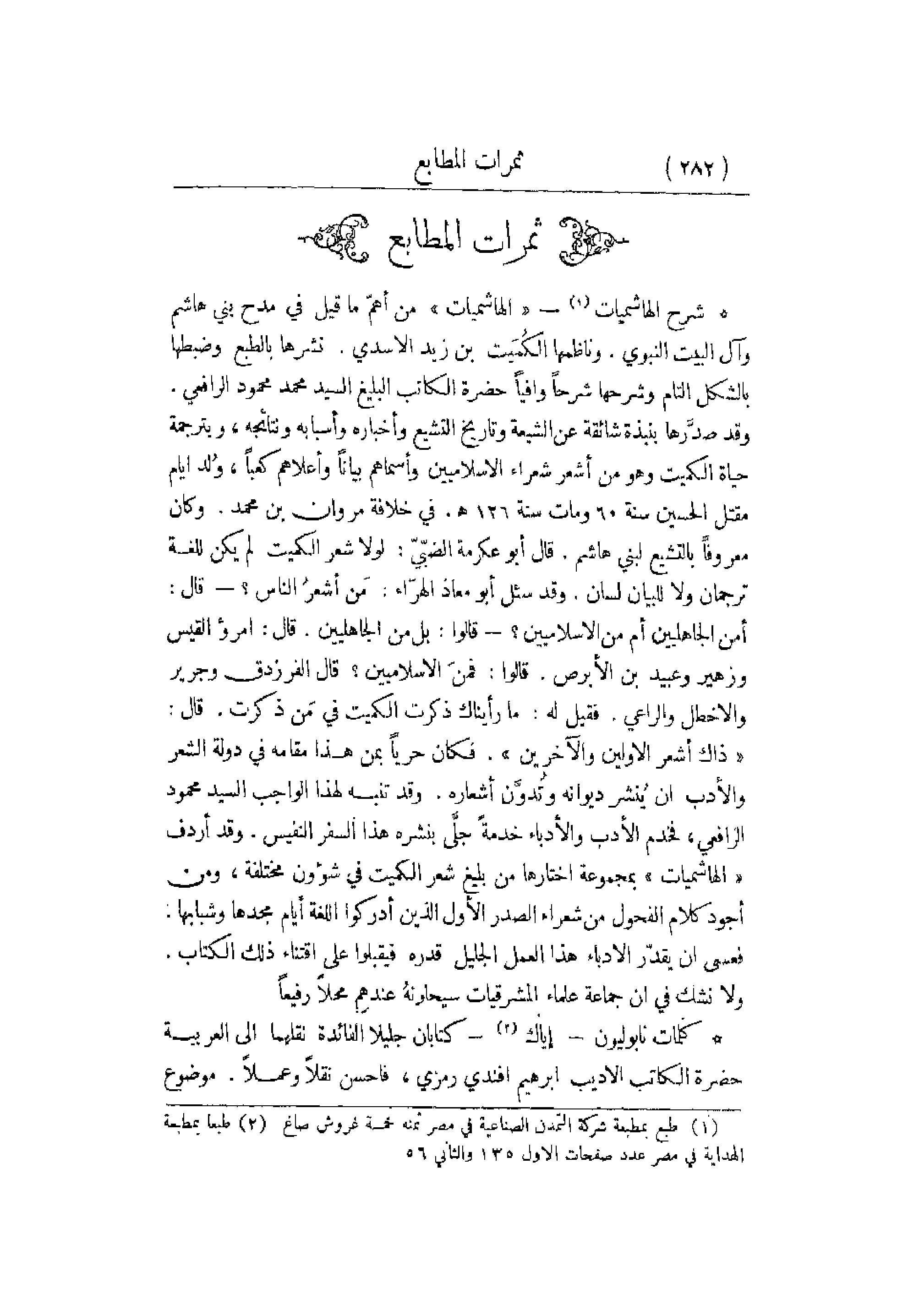 شرح الهاشميات - الهاشميات من أهمّ ما قيل في مدح بني هاشم وآل البيت النبوي. وناظمها الكُمَيت بن زيد الأسدي. نشرها بالطبع وضبطها بالشكل التام وشرحها شرحاً وافياً حضرة الكاتب البليغ السيد محمد محمود الرافعي. وقد صدَّرها بنبذة شائقة عن الشيعة وتاريخ التشيع وأخباره وأسبابه ونتائجه , وبترجمة حياة الكميت وهو من أشعر شعراء الإسلاميين وأسماهم بياناً وأعلاهم كعباً , وُلد أيام مقتل الحسين سنة 60 ومات سنة 126 هـ. في خلافة مروان بن محمد. وكان معروفاً بالتشيع لبني هاشم. قال سئل أبو معاذ الهرّاء: مَن أعرُ الناس؟ - قال: أمن الجاهليين أم من الإسلاميين؟ قالوا: بل من الجاهليين. قال: قال الفرزدق وجرير والأخطل والراعي. فقيل له: ما رأيناك ذكرت الكميت في مَن ذكرت. قال: ذاك أشعر الأولين والآخرين. فكان حرياً بمن هذا مقامه في دولة الشعر والأدب أن يُنشر ديوانه وتُدوَّن أشعاره. وقد تنبه لهذا الواجب السيد محمود الرافعي , فخدم الأدب والأدباء خدمةً جلَّي بنشره هذا السفر النفيس. وقد أردف الهاشميات بمجموعة اختارها من بليغ شعر الكميت في شؤون مختلفة , ومن أجود كلام الفحول من شعراء الصدر الأول الذين أدركوا اللغة أيام مجدها وشبابها. فعسى أن يقدّر الأدباء هذا العمل الجليل قدره فيقبلوا على اقتناء ذلك الكتاب.