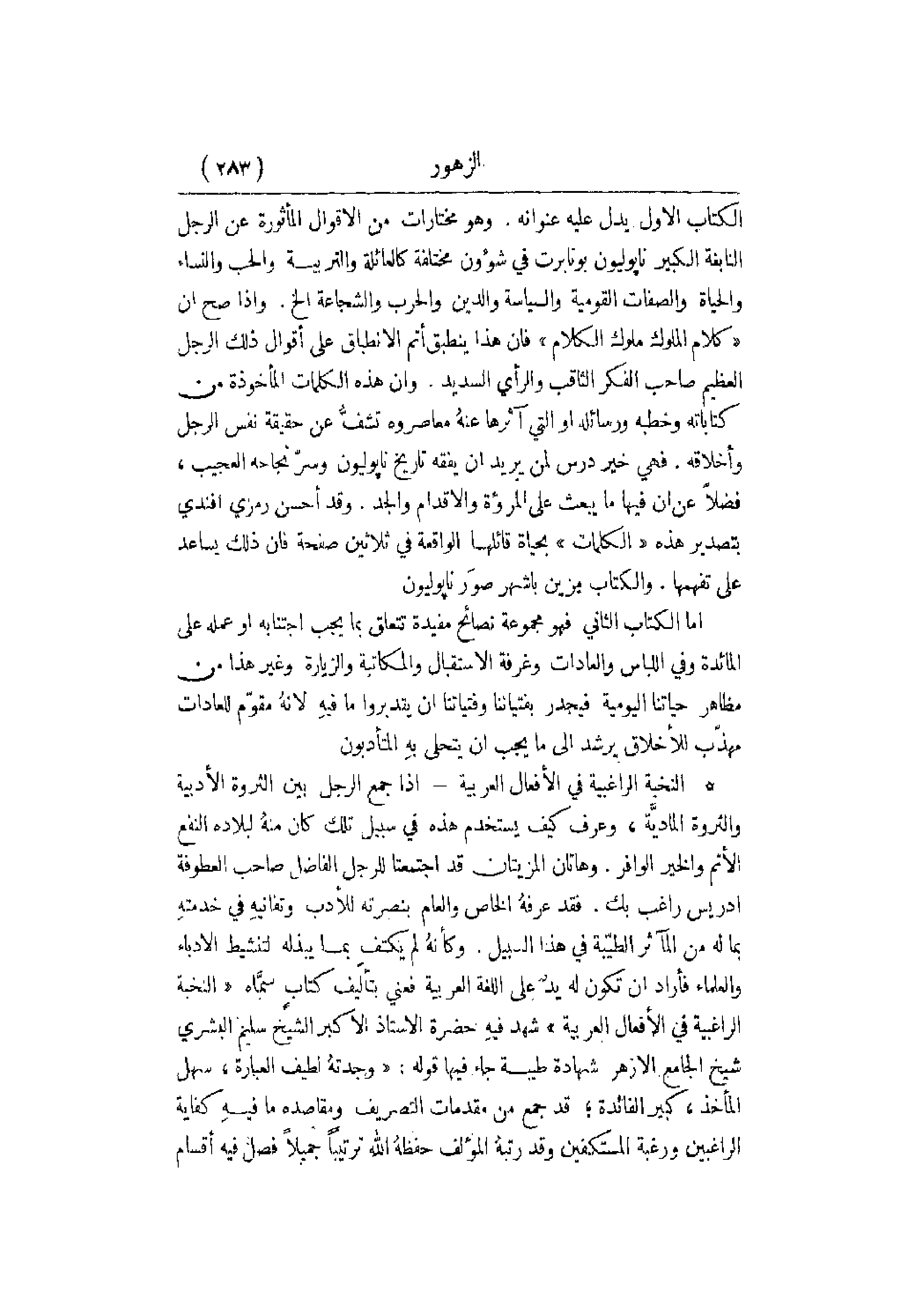 الكتاب الأول يدل عليه عنوانه. وهو مختارات من الأقوال المأثورة عن الرجل النابغة الكبير نابوليون بونابرت في شؤون مختلفة كالعائلة والتربية والحب والنساء والحياة والصفات القومية والسياسية والدين والحرب والشجاعة الخ. وإذا صح أن كلام الملوك ملوك الكلام فإن هذا ينطبق أتم الانطباق على أقوال ذلك الرجل العظيم صاحب الفكر الثاقب والرأي السديد. وأن هذه الكلمات المأخوذة من كتاباته وخطبه ورسائله أو التي آثرها عنهُ معاصروه تشفُّ عن حقيقة نفس الرجل وأخلاقه. فهي خير درس لمن يريد أن يفقه تاريخ نابوليون وسرّ نجاحه العجيب , فضلاً عن أن فيها ما يبعث على المرؤة والإقدام والجد. وقد أحسن رمزي أفندي بتصدير هذه (0الكلمات بحياة قائلها الواقعة في ثلاثين صفحة فإن ذلك يساعد على تفهمها. والكتاب مزين بأشهر صوَر نابوليون. أما الكتاب الثاني فهو مجموعة نصائح مفيدة بما يجب اجتنابه