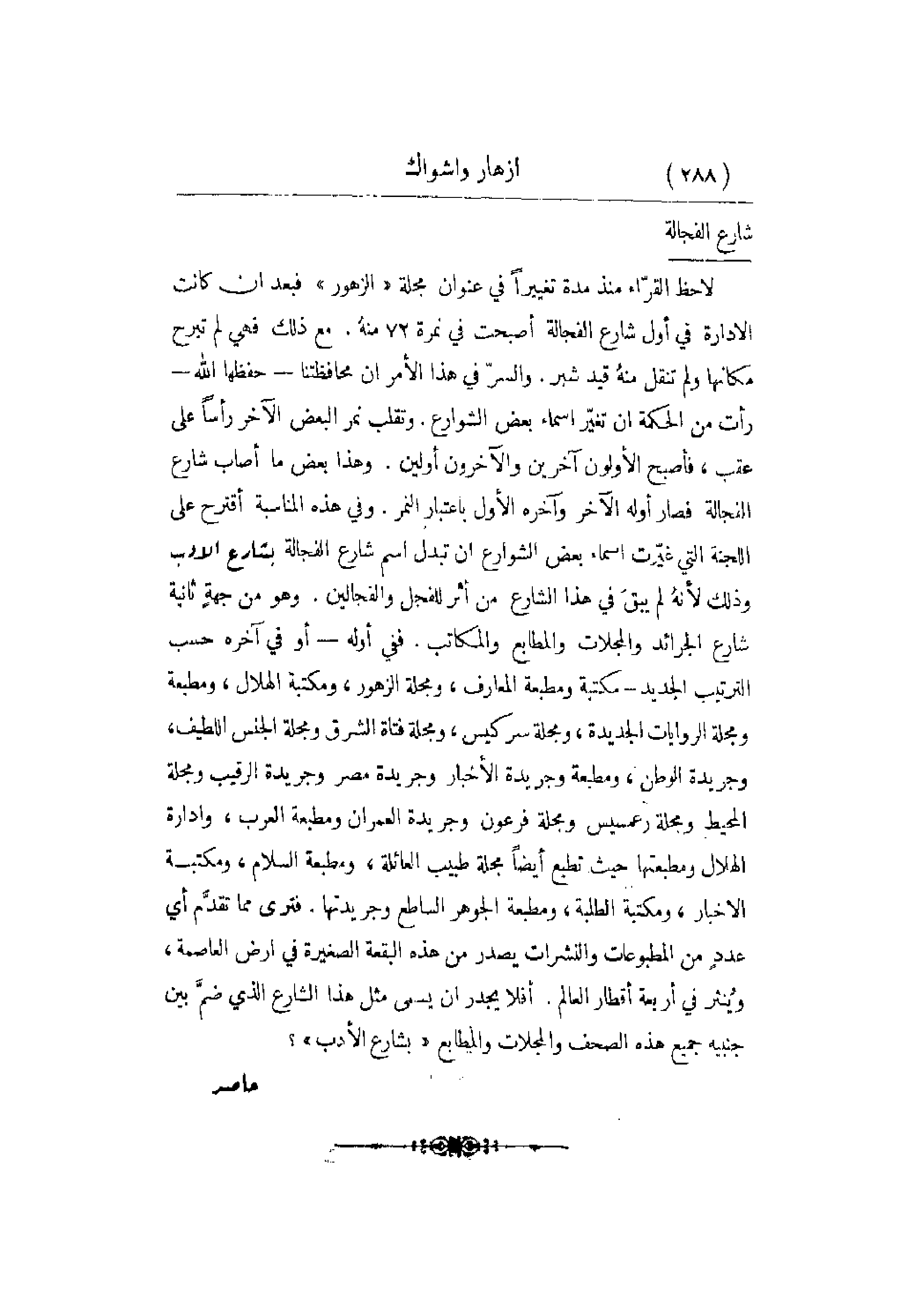 لاحظ القرّاء منذ مدة تغييراً في عنوان مجلة الزهور فبعد أن كانت الإدارة في أول شارع الفجالة أصبحت في نمرة 72 منهُ. مع ذلك فهي لم تبرح مكانها ولم تنقل منهُ قيد شبر. والسرُّ في هذا الأمر أن محافظتنا - حفظها الله - رأت من الحكمة أن تغيّر أسماء بعض الشوارع. وتقلب نمر البعض الآخر رأساً على عقب , فأصبح الأولون آخرين والآخرون أولين: وهذا بعض ما أصاب شارع الفجالة فصار أوله الآخر وآخره الأول باعتبار النمر. وفي هذه المناسبة أقترح على اللجنة التي غيّرت أسماء بعض الشوارع أن تبدل اسم شارع الفجالة بشارع الأدب وذلك لأنهُ لم يبقَ في هذا الشارع من أثر للفجل والفجالين. وهو من جهةٍ ثانية شارع الجرائد والمجلات والمطابع والمكاتب. ففي أوله - أو في أخره حسب الترتيب الجديد - مكتبة ومطبعة المعارف , ومجلة الزهور , ومكتبة الهلال , ومطبعة ومجلة الروايات الجديدة , ومجلة سركيس , ومجلة فتاة الشرق ومجلة الجنس اللطيف ,
