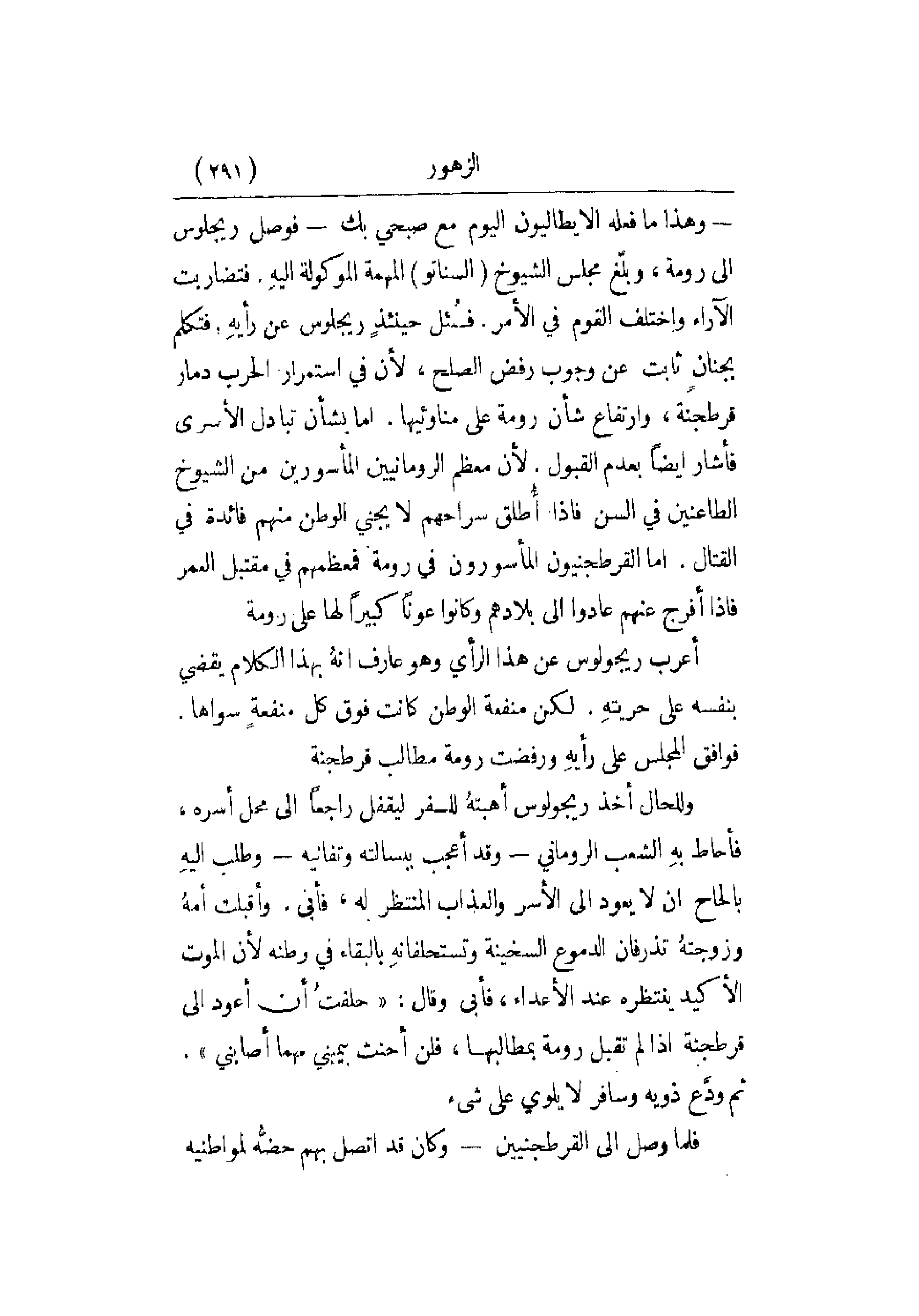ريجلوس إلى رومة , وبلّغ مجلس الشيوخ السناتو المهمة الموكولة إليهِ. فتضاربت الآراء واختلف القوم في الأمر. فُسئل حينئذٍ ريجلوس عن رأيهِ. فتكلم بجنان ثابت عن وجوب رفض الصلح , لأن في استمرار الحرب دمار قرطجنة , وارتفاع شأن رومة على مناوئيها. أما بشأن تبادل الأسرى فأشار أيضاً بعدم القبول. لأن أُطلق سراحهم لا يجني الوطن منهم فائدة في القتال. أما القرطجنيون المأسورون في رومة فمعظمهم في مقتبل العمر فإذا أفرج عنهم عادوا إلى بلادهم وكانوا عوناً كبيراً لها رومة. أعرب ريجلوس عن هذا الرأي وهو عارف أنهُ بهذا الكلام يقضي بنفسه على حريتهِ. لكن منفعة الوطن كانت فوق كل منفعةٍ سواها. فوافق المجلس على رأيهِ ورفضت رومة مطالب قرطجنة. وللحال أخذ ريجولوس أهبتهُ للسفر ليقفل راجعاً إلى محل أسره فأحاط بهِ الشعب الروماني - وقد أعجب ببسالته وتفانيه - وطلب إليهِ بإلحاح أن لا يعود إلى الأسر والعذاب المنتظر له , فأبى. وأقبلت أمهُ وزوجتهُ تذوقان الدموع السخينة وتستحلفانهِ بالبقاء في وطنه لأن الموت الأكيد ينتظره عند الأعداء , فأبى وقال: حلفتُ أن أعود إلى قرطجنة إذا لم تقبل رومة بمطالبها , فلن أحنث بيمني مهما أصابني ثم ودَّع ذويه وسافر لا يلوي على شيء.