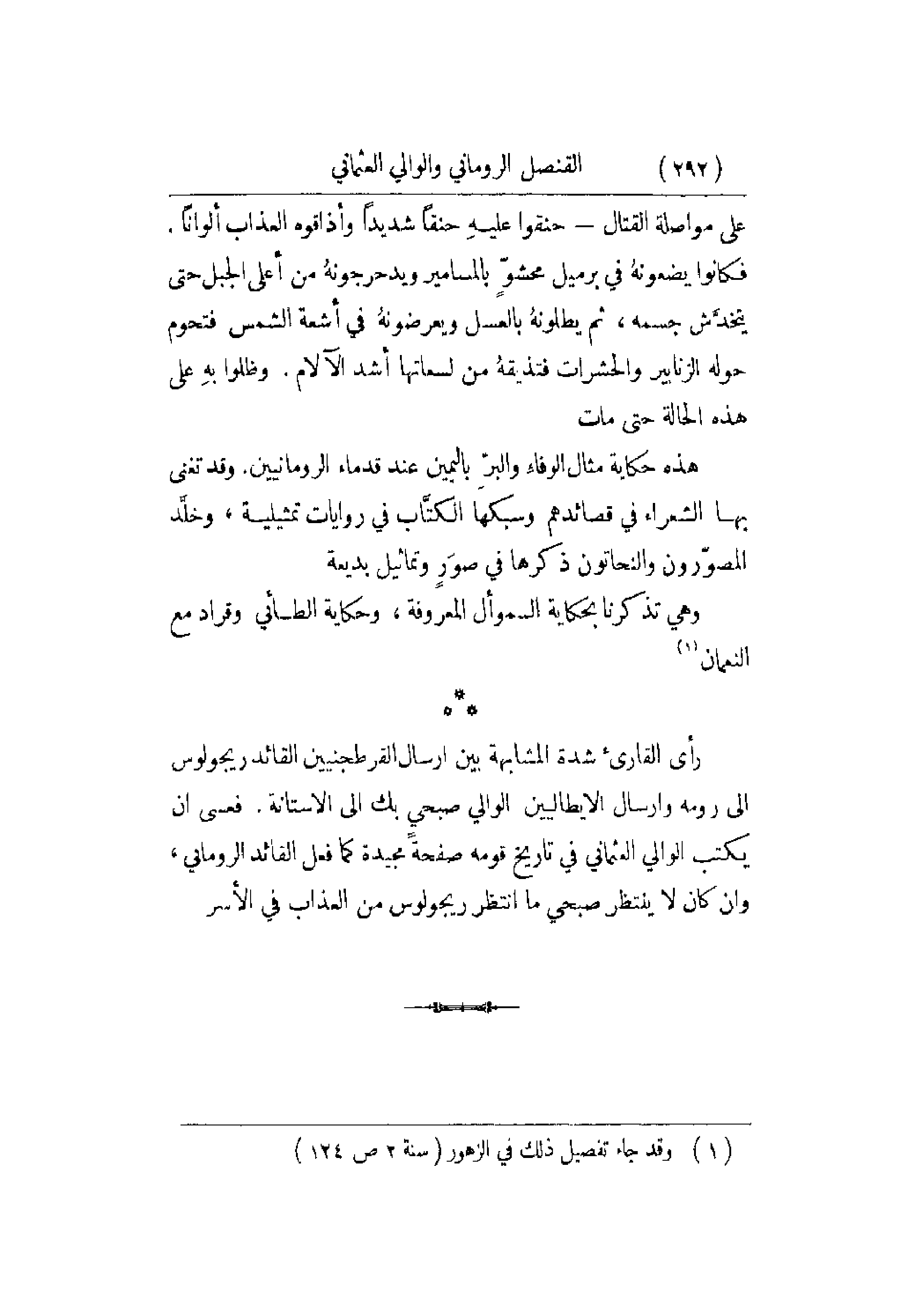 على مواصلة القتال - حنقوا عليهِ حنقاً شديداً وأذاقوه العذاب ألواناً. فكانوا يضعونهُ في برميل محشوٍّ بالمسامير ويدحرجونهُ من أعلى الجبل حتى يتخدَّش جسمه , ثم يطلونهُ بالعسل ويعرضونهُ في أشعة الشمس فتحوم حوله الزنانير والحشرات فتذيقهُ من لسعاتها أشد الآلام. وظلوا بهِ على هذه الحالة حتى مات. هذه حكاية مثال الوفاء والبرِّ باليمين عند قدماء الرومانيين. وقد تغنى بها الشعراء في قصائدهم وسبكها الكتَّاب في روايات تمثيلية , وخلَّد المصوّرون والنحاتون ذكرها في صوَرٍ وتماثيل بديعة. وهي تذكرنا السموأل المعروفة , وحكاية الطائي وقراد مع النعمان.