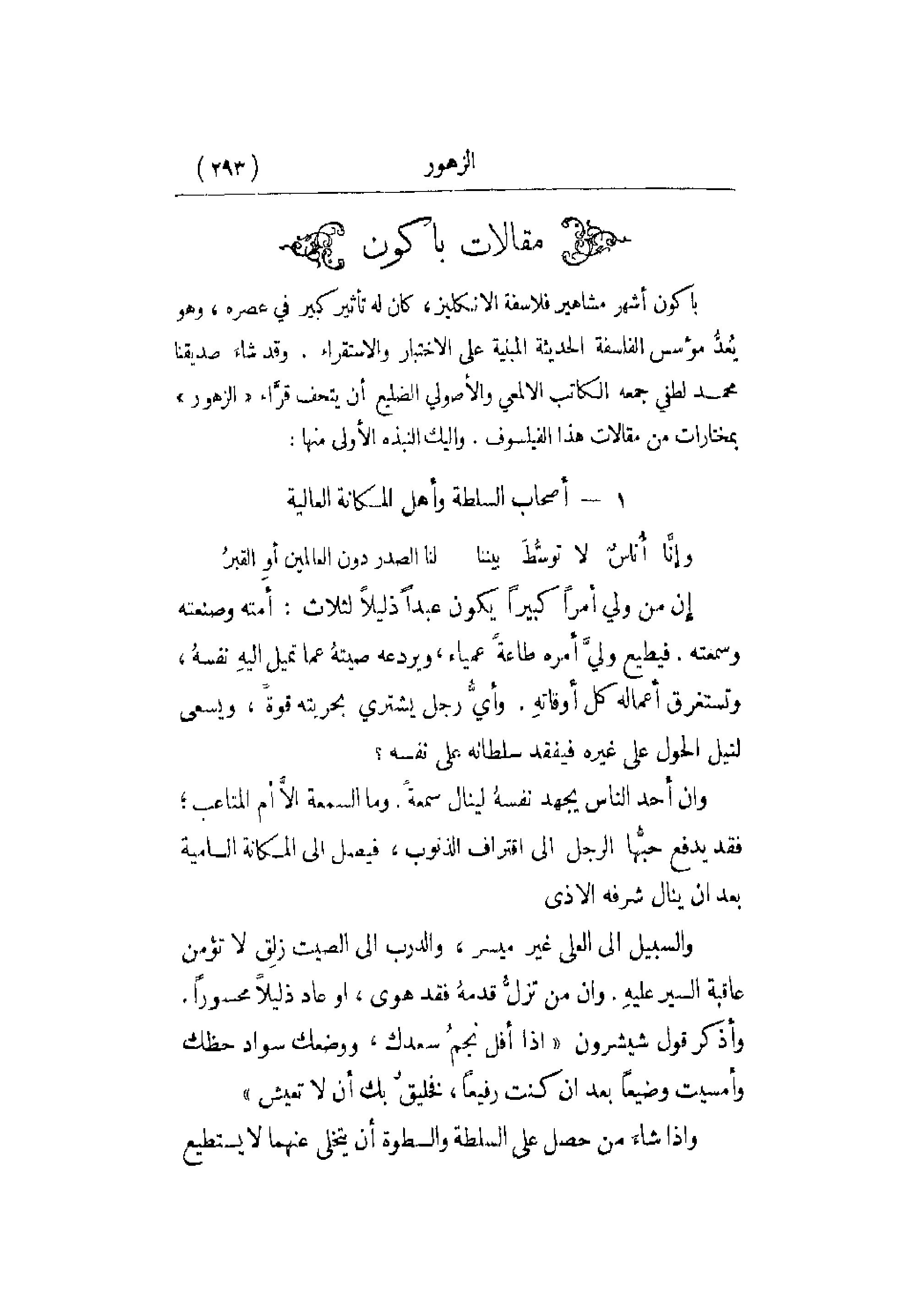 باكون أشهر مشاهير فلاسفة الانكليز , كان له تأثير كبير في عصره , وهو يُعدُّ مؤسس الفلسفة الحديثة المبنية على الاختبار والاستقراء. وقد شاءَ صديقنا محمد لطفي جمعه الكاتب الألمعي والأصولي الضليع أن يتحف قرَّاء الزهور بمختارات من مقالات الفيلسوف. وإليك النبذة الأولى منها: