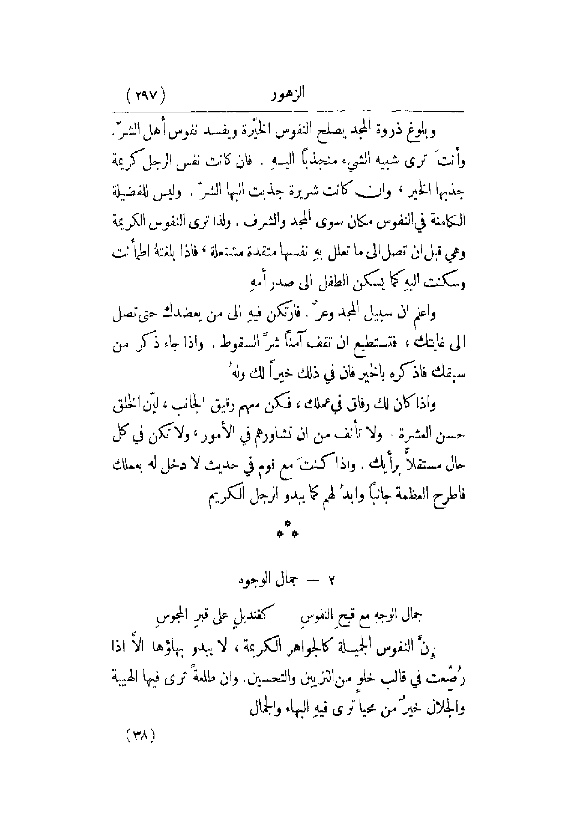 إنَّ النفوس الجميلة كالجواهر الكريمة , لا يبدو بهاؤها إلاَّ إذا رُصِّعت في قالب خلوٍ من التزيين والتحسين. وإن طلعةً ترى فيها الهيبة والجلال خيرٌ من محيا ترى فيهِ البهاء والجمال.
