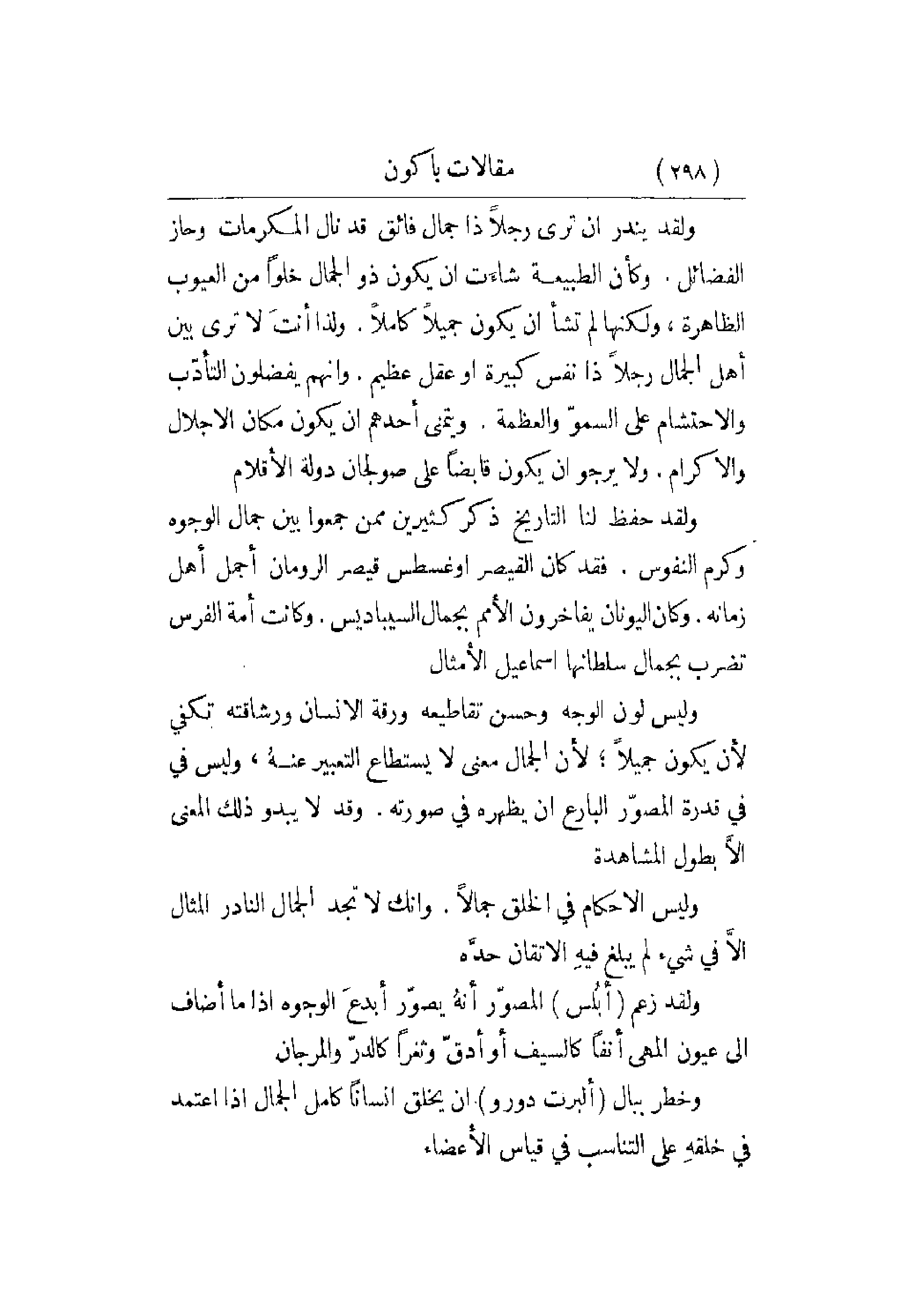 كثيرين ممن جمعوا بين جمال الوجوه وكرم النفوس. فقد كان القيصر أوغسطس قيصر الرومان أجمل أهل زمانه. وكان اليونان يفاخرون الأمم بجمال السيباديس. وكانت أمة الفرس تضرب بجمال سلطانها إسماعيل الأمثال. وليس لون الوجه وحسن تقاطيعه ورقة الإنسان ورشاقته تكفي لأن يكون جميلا؛ لأن الجمال معنى لا يستطاع التعبير عنهُ , وليس في قدرة المصوّر البارع أن يظهره في صورته. وقد لا يبدو ذلك المعنى إلاَّ بطول المشاهدة. وليس الأحكام في الخلق جمالا. وإنك لا نجد الجمال النادر المثال إلاَّ في شيء لم يبلغ فيهِ الإتقان حدَّه. ولقد زعم أبُلس المصوّر أنهُ يصوّر أبدعَ الوجوه إذا ما أضاف إلى عيون المهى أنفاً كالسيف أو أدقّ وثغراً كادرّ والمرجان. وخطر ببال ألبرت دورو أن يخلق إنساناً كامل الجمال إذا اعتمد في خلقهِ على التناسب في قياس الأعضاء.