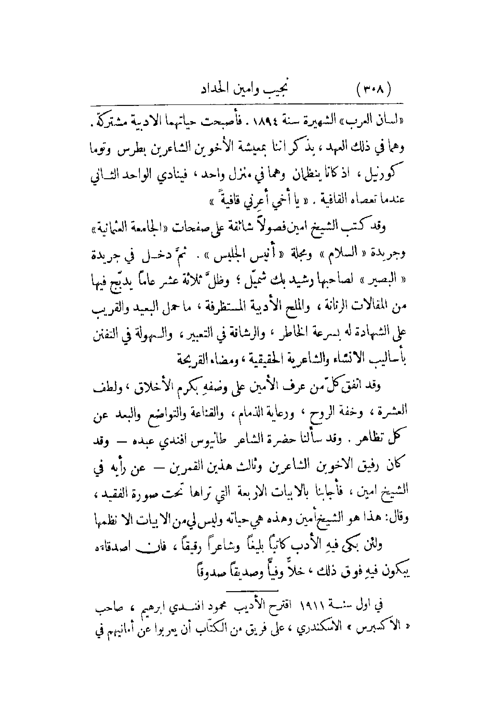 لسان العرب الشهيرة سنة 1894. فأصبحت حياتهما الأدبية مشتركة. وهما في ذلك العهد , يذكر أننا بمعيشة الأخوين الشاعرين بطرس وتوما كورنيل , إذ كانا ينظمان وهما في منزل واحد , فينادي الواحد الثاني عندما تعصاه القافية. يا أخي أعرني قافية. وقد كتب الشيخ أمين فصولاً شائقة على صفحات الجامعة العثمانية وجريدة السلام ومجلة أنيس الجليس. ثمَّ دخل في جريدة البصير لصاحبها رشيد بك شميّل؛ وظلَّ ثلاثة عشر عاماً يدبّج فيها من المقالات الرنانة , والملح الأدبية المستظرفة , ما حمل البعيد والقريب على الشهادة له بسرعة الخاطر , والرشاقة في التعبير , والسهولة في التفنن بأساليب الإنشاء والشاعرية الحقيقية , ومضاء القريحة. وقد اتفق كلّ من عرف الأمين على وصفهِ بكرم الأخلاق , ولطف العشرة , وخفة الروح , ورعاية الذمام , والقناعة والتواضع والبعد عن كل تظاهر. وقد سألنا حضرة الشاعر طانيوس أفندي عبده - وقد كان رفيق الأخوين الشاعرين وثالث هذين القمرين - عن رأيه في الشيخ أمين , فأجابنا بالأبيات الأربعة التي تراها تحت صورة الفقيد , وقال: هذا هو الشيخ أمين وهذه حياته وليس لي من الأبيات إلا نظمها. ولئن بكى فيهِ الأدب كاتباً بليغاً وشاعراً رقيقاً , فإن أصدقاءَه يبكون فيهِ فوق ذلك , خلاًّ وفيّاً وصديقاً صدوقاً.