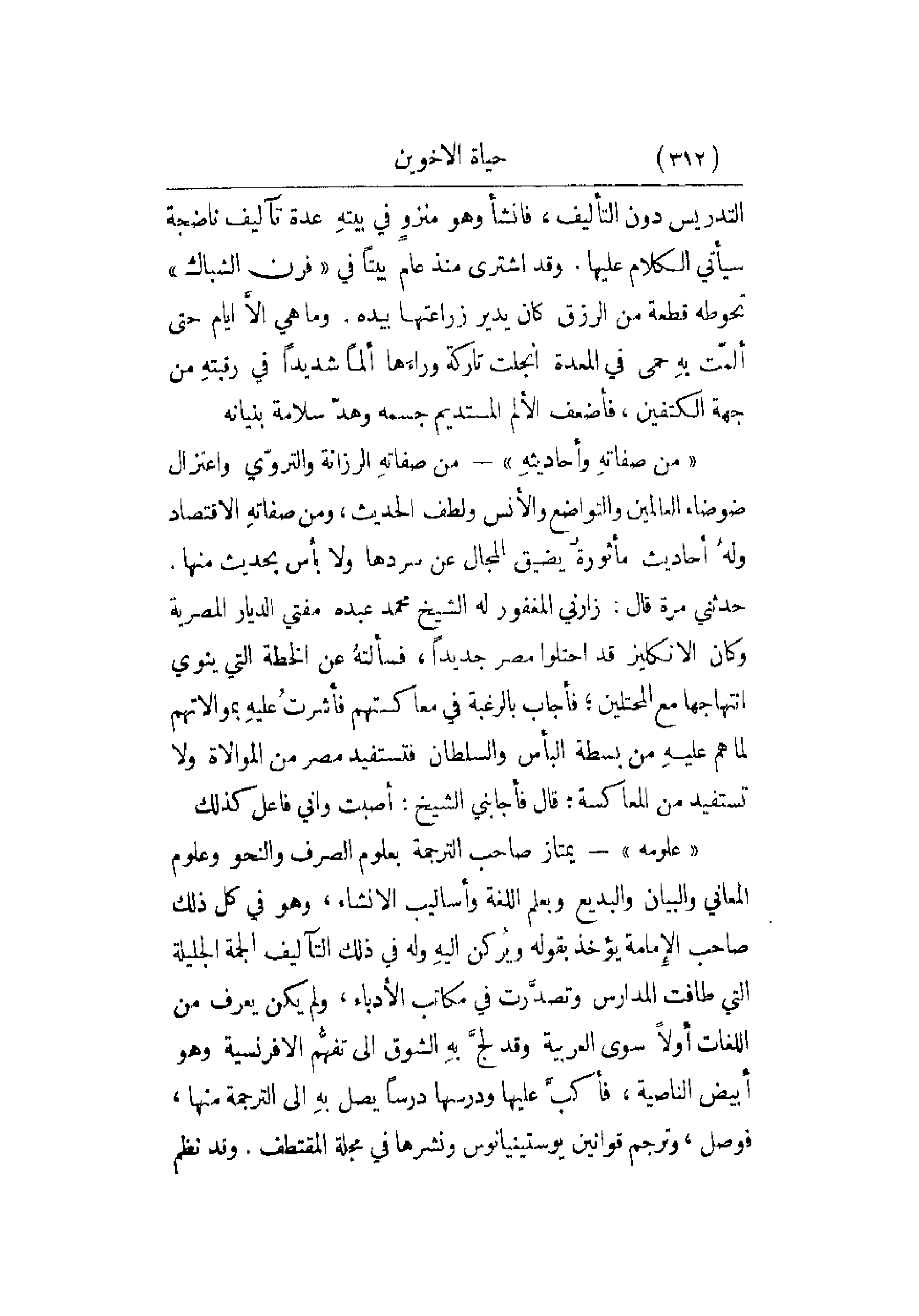 من صفاتهِ وأحاديثهِ - من صفاتهِ الرزانة والتروّي واعتزال ضوضاء العالمين والتواضع والأنس ولطف الحديث , ومن صفاتهِ الاقتصاد ولهُ أحاديث مأثورةٌ يضيق المجال عن سردها ولا بأس بحديث منها. حدثني مرة قال: زارني المغفور له الشيخ محمد عبده مفتي الديار المصرية وكان الانكليز قد احتلوا مصر جديداً , فسألتهُ عن الخطة التي ينوي انتهاجها مع المحتلين؛ فأجاب بالرغبة في معاكستهم فأشرتُ عليهِ بموالاتهم لما هم عليهِ من بسطة البأس والسلطان فتستفيد مصر من الموالاة ولا تستفيد من المعاكسة: قال فأجابني الشيخ: أصبت وأني فاعل كذلك.