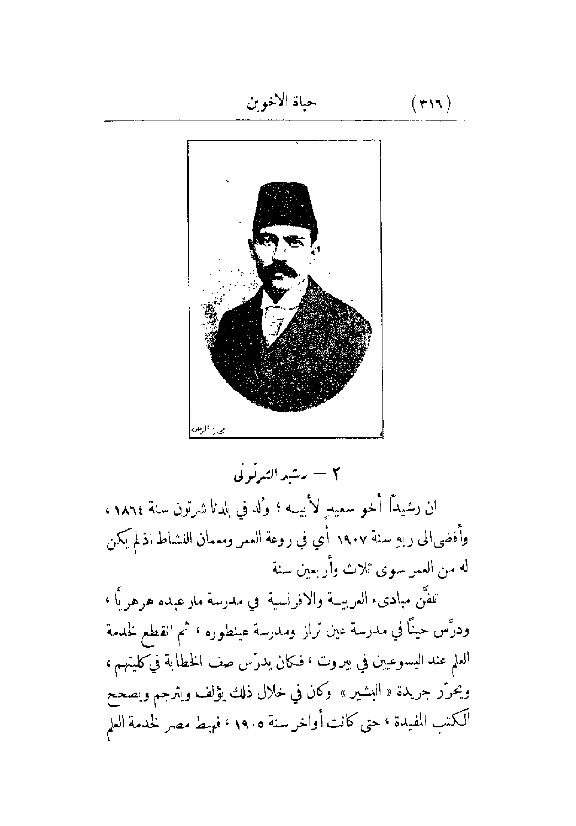 أن رشيداً أخو سعيدٍ لأبيه؛ وُلد في بلدنا شرتون سنة 1864 , وأفضى إلى ربهِ سنة 1907 أي في روعة العمر ومعمان النشاط إذ لم يكن له من العمر سوى ثلاث وأربعين سنة. تلقَّن مبادئ العربية والافرنسية في مدرسة مار عبده هرهريَّا , ودرَّس حيناً في مدرسة عين تراز ومدرسة عينطوره , ثم انقطع لخدمة العلم عند اليسوعيين في بيروت , فكان يدرّس صف الخطابة في كليتهم , ويحرّر جريدة البشير وكان في خلال ذلك يؤلف ويترجم ويصحح الكتب المفيدة , حتى كانت أواخر سنة 1905 , فهبط مصر لخدمة العلم