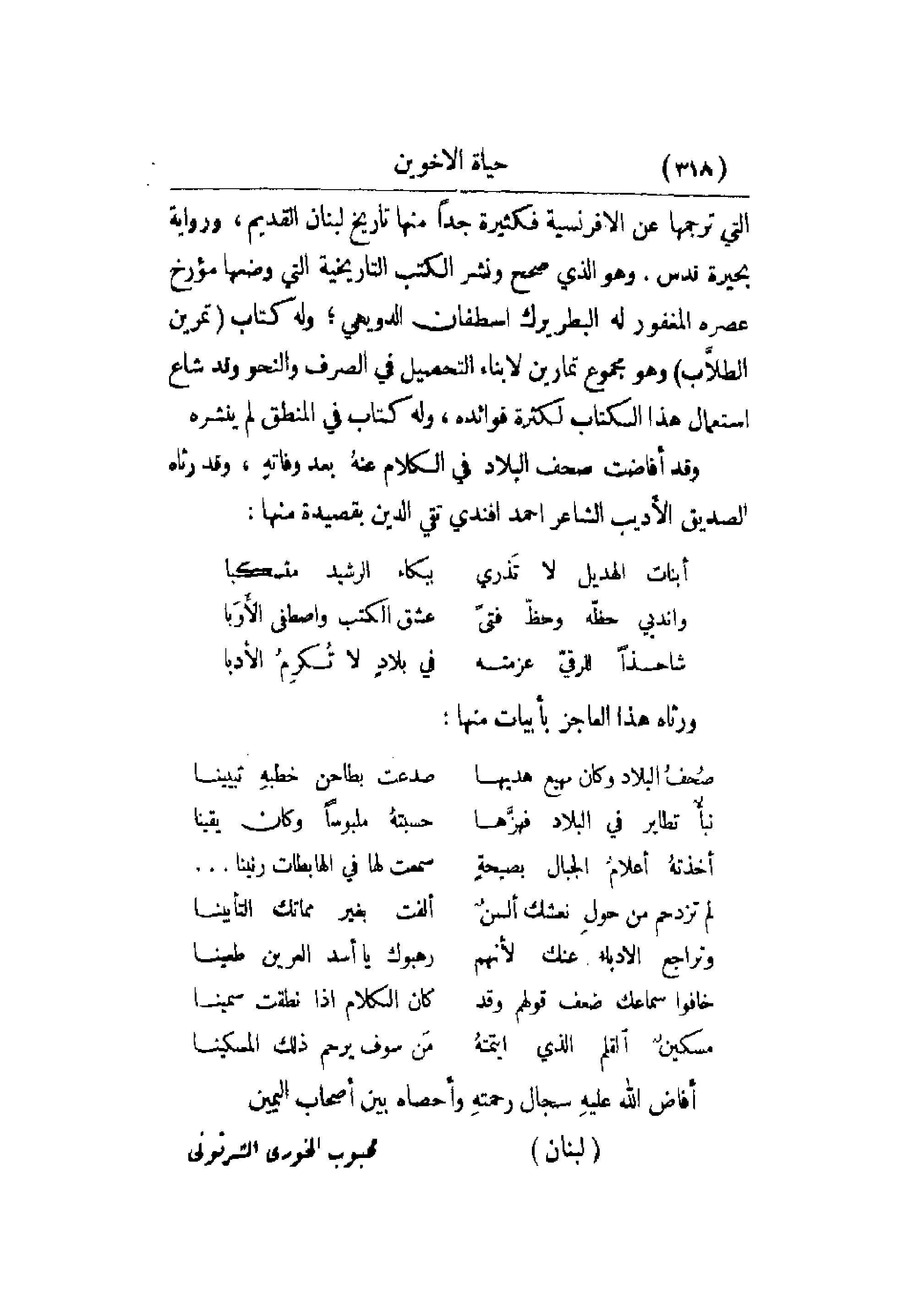 التي ترجمها عن الافرنسية فكثيرة جداً منها تاريخ لبنان القديم , ورواية بحيرة قدس. وهو الذي صحح ونشر الكتب التاريخية التي وضعها مؤرخ عصره المغفور له البطريرك اسطفان الدويهي؛ وله كتاب تمرين الطلاَّب وهو مجموع تمارين لأبناء التحصيل في الصرف والنحو وقد شاع استعمال هذا الكتاب لكثرة فوائده , وله كتاب في المنطق لم ينشره. وقد أفاضت صحف البلاد في الكلام عنهُ بعد وفاهِ , وقد رثاه الصديق الأديب الشاعر أحمد أفندي تقي الدين بقصيدة منها: