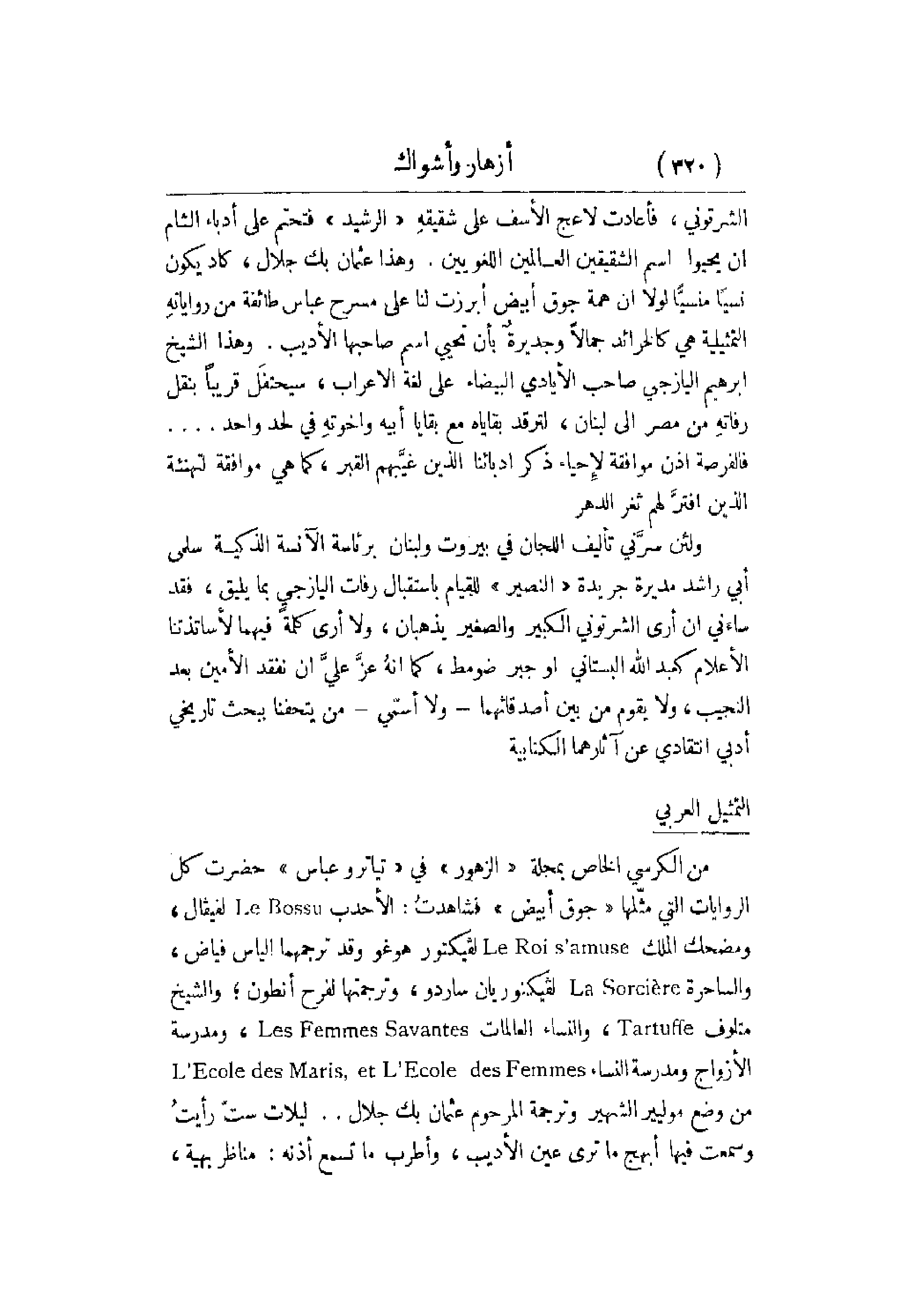 الشرتوني , فأعادت لاعج الأسف على شقيقهِ الرشيد فتحتم على أدباء الشام أن يحيوا اسم الشقيقين العالمين اللغويين. وهذا عثمان بك جلال , كاد يكون نسيَّا لولا أن همة جوق أبيض أبرزت لنا على مسرح عباس طائفة من رواياتهِ التمثيلية هي كالخرائد جمالاً وجديرةٌ بأن تحيي على لغة الإعراب , سيحتفَل قريباً بنقل رفاتهِ من مصر إلى لبنان ,
