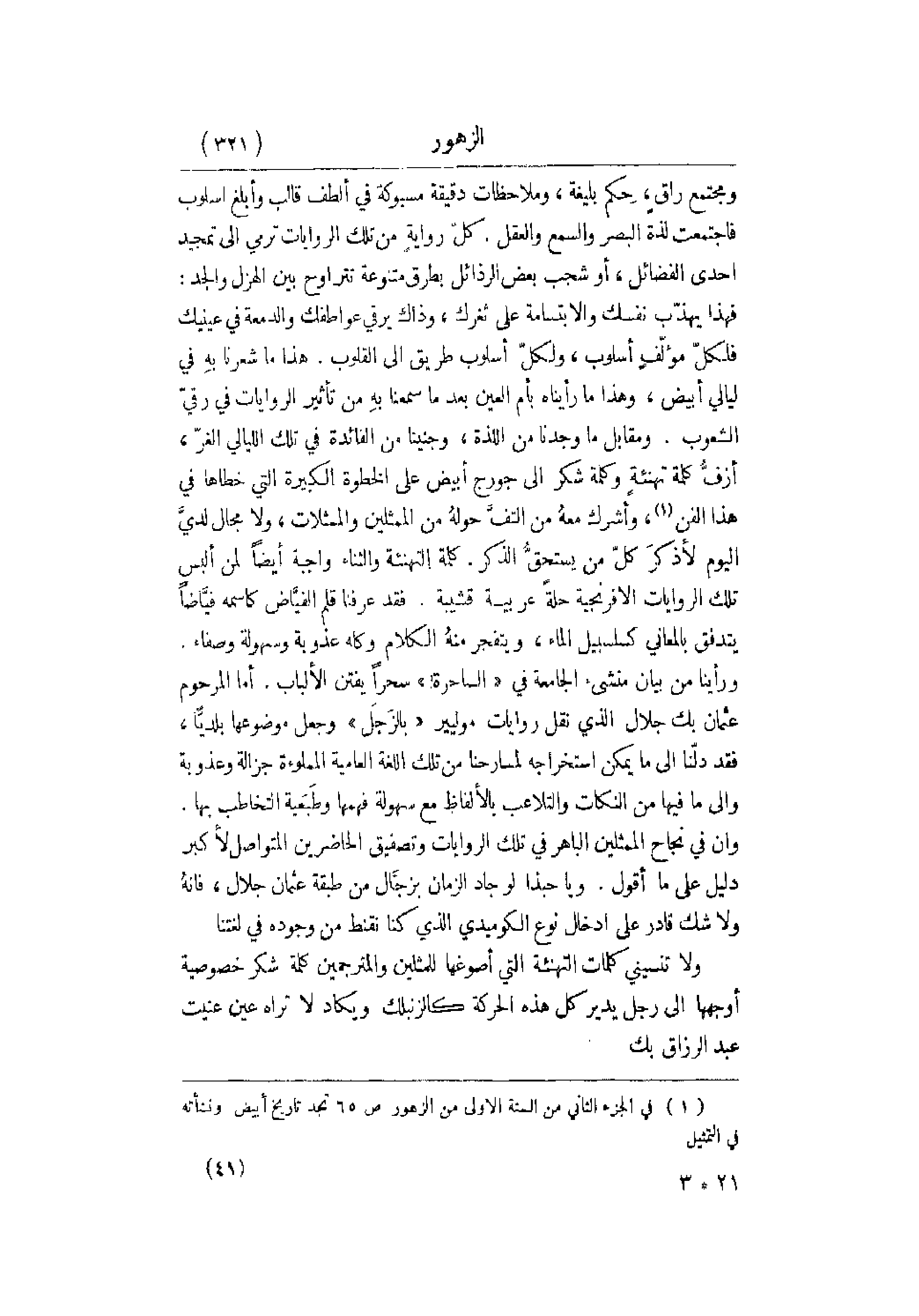 تلك اللغة العامية المملوءة جزالة وعذوبة وإلى ما فيها من النكات والتلاعب بالألفاظ مع سهولة فهمها وطَبَعية التخاطب بها. وأن في نجاح الممثلين الباهر في تلك الروايات وتصفيق الحاضرين المتواصل لأكبر دليل على ما أقول. ويا حبذا لو جاد الزمان بزجَّال من طبقة عثمان جلال , فإنهُ ولا شك قادر على إدخال نوع الكوميدي الذي كنا نقنط من وجوده في لغتنا. ولا تنسيني كلمات التهنئة التي أصوغها للمثلين والمترجمين كلمة شكر خصوصية أوجهها إلى رجل يدير كل هذه الحركة كالزنبلك ويكاد لا تراه عين عنيت عبد الرزاق بك.