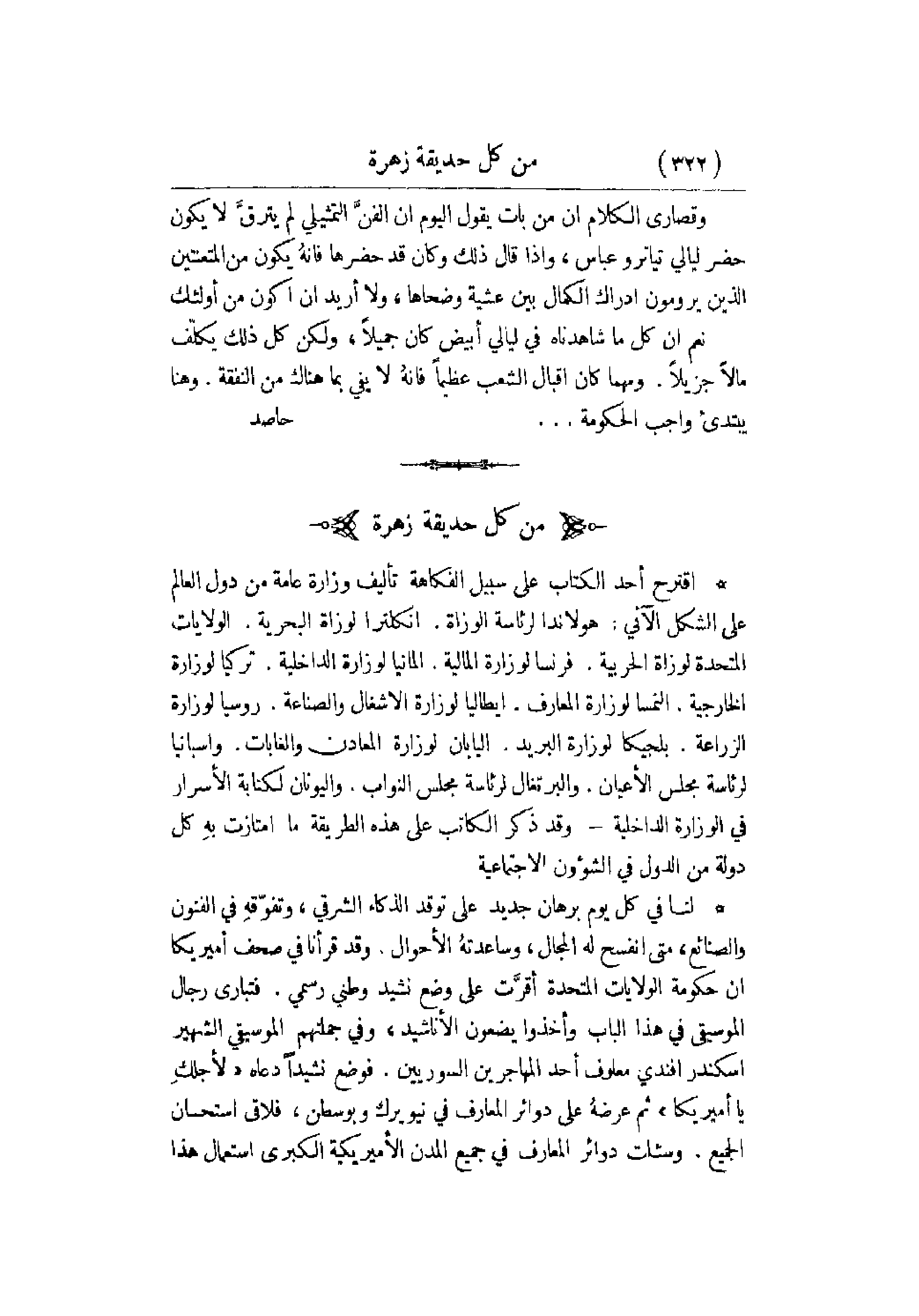اقترح أحد الكتاب على سبيل الفكاهة تأليف وزارة عامة من دول العالم على الشكل الآتي: هولاندا لرئاسة الوزارة. انكلترا لوزارة البحرية. الولايات المتحدة لوزارة الحربية. فرنسا لوزارة المالية. ألمانيا لوزارة الداخلية. تركيا لوزارة الخارجية. النمسا لوزارة المعارف. إيطاليا لوزارة الأشغال والصناعة. روسيا لوزارة الزراعة. بلجيكا لوزارة البريد. اليابان لوزارة المعادن والغابات. وإسبانيا لرئاسة مجلس الداخلية وقد ذكر الكاتب على هذه الطريقة ما امتازت بهِ كل دولة من الدول في الشؤون الاجتماعية. لنا في كل يوم برهان جديد على توقد الذكاء الشرقي , وتفوّقهِ في الفنون والصنائع , متى أنفسح له المجال , وساعدتهُ الأحوال. وقد قرأنا في صحف أميريكا أن حكومة الولايات المتحدة أقرَّت على وضع نشيد وطني رسمي. فتبارى رجال الموسيقي في هذا الباب وأخذوا يضعون الأناشيد , وفي حملتهم الموسيقي الشهير اسكندر أفندي معلوف أحد المهاجرين السوريين. فوضع نشيداً دعاه لأجلكِ يا اميريكا ثم عرضهُ على دوائر المعارف في نيويرك وبوسطن , فلاقى استحسان الجميع. وسئات دوائر المعارف في جميع المدن الأميريكية الكبرى استعمال هذا