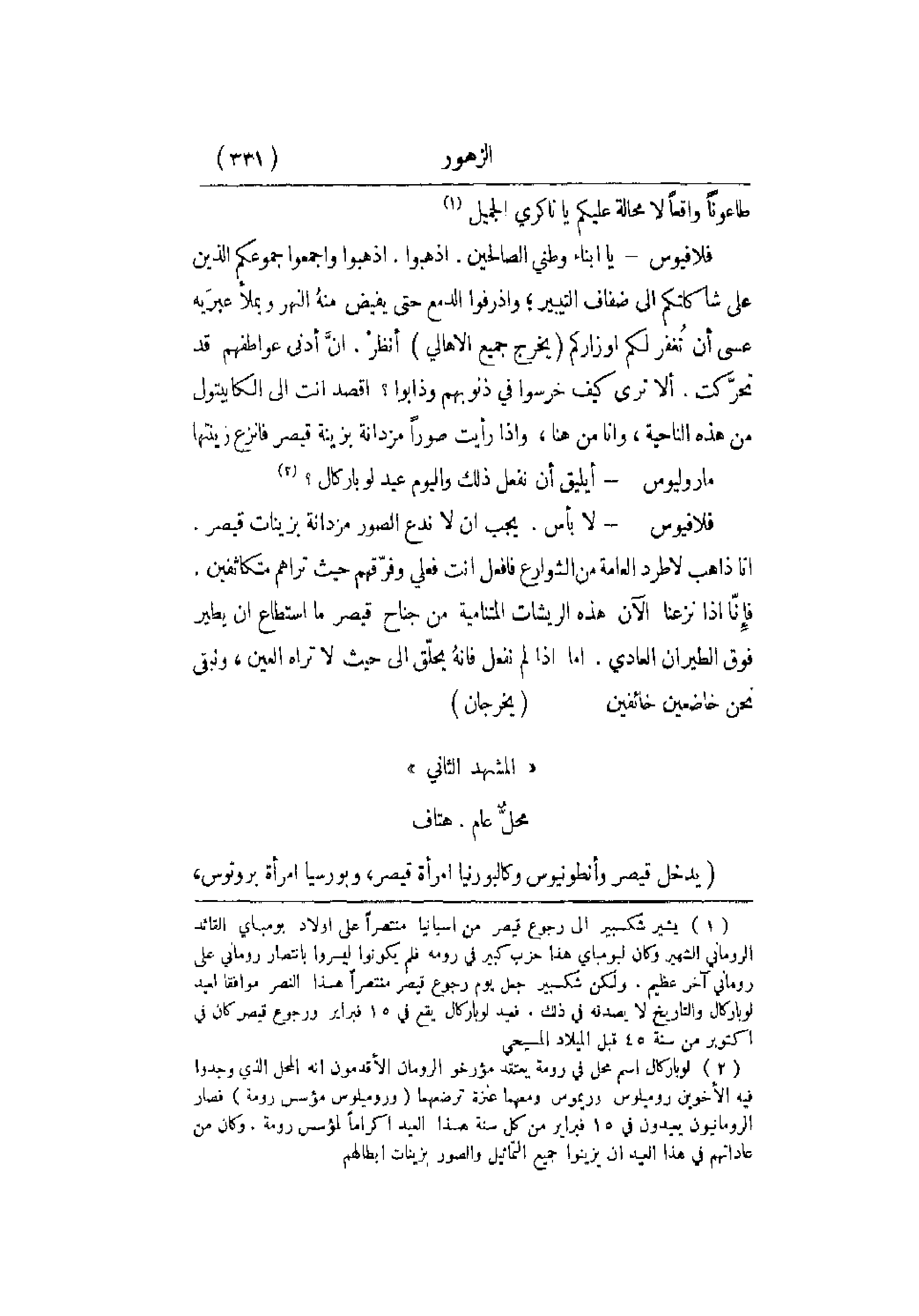 فلافيوس - يا أبناء وطني الصالحين. اذهبوا. واجمعوا جموعكم الذين على شاكلتكم إلى ضفاف التيبير؛ واذرفوا الدمع حتى يفيض منهُ النهر ويملأ عبرَيه عسى أن تُغفر لكم أوزاركم يخرج جميع الأهالي أنظرْ. أنَّ أدنى عواطفهم قد تحرّكت. ألا ترى كيف خرسوا في ذنوبهم وذابوا؟ أقصد أنت إلى الكابيتول من هذه الناحية , وأنا من هنا , وإذا رأيت صوراً مزدانة بزينة قيصر فانزع زينتها