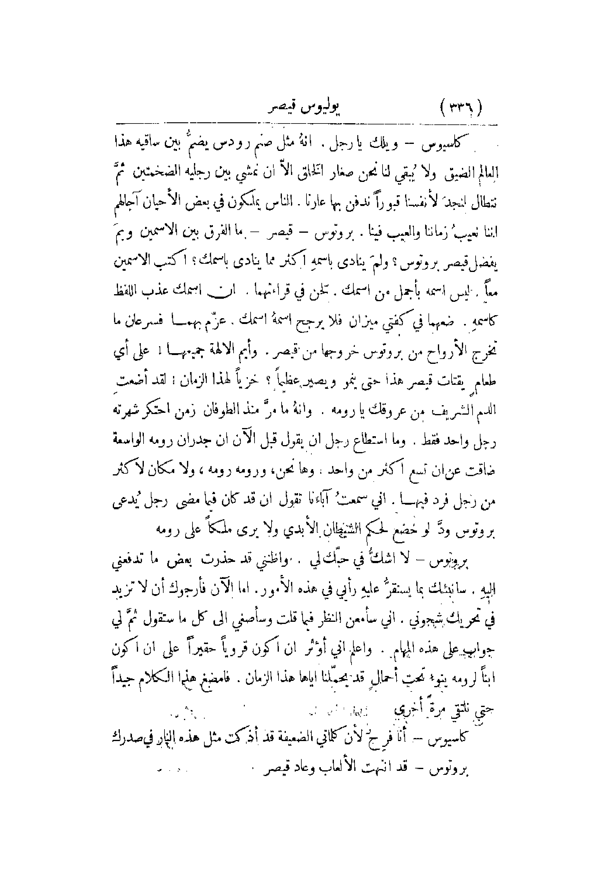 بروتوس - لا أشكُّ في حبّك لي. واظنني قد حذرت بعض ما تدفعني إليهِ. سأنبئك بما يستقرُّ عليهِ رأيي في هذه الأمور. أما الآن فأرجوك أن لا تزيد في تحريك شجوني. إني سأمعن النظر فيما قلت وسأصغي إلى كل ما ستقول ثمَّ لي جواب على هذه المهام. واعلم أني أؤثر أن أكون قروياً حقيراً على أن أكون ابناً لرومه ينوءُ تحت أحمال قد يحمّلنا إياها هذا الزمان. فأمضغ هذا الكلام جيداً حتى نلتقي مرةً أخرى.