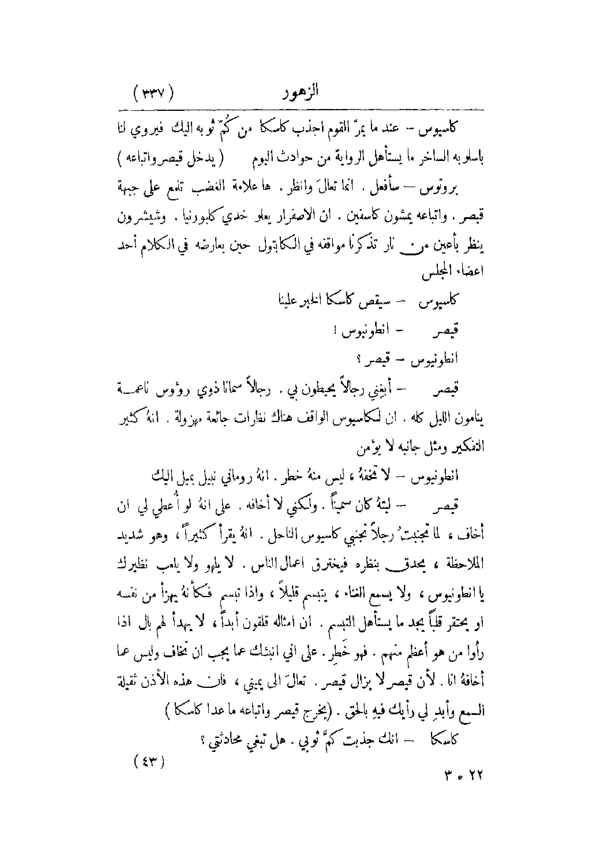 قيصر - لما تجنبتُ رجلاً تجنبي كاسيوس الناحل. أنهُ يقرأ كثيراً , وهو شديد الملاحظة , يحدق بنظره فيخترق أعمال الناس. لا يلهو ولا يلعب نظيرك يا انطونيوس , ولا يسمع الغناء , يتبسم قليلاً , وإذا تبسم فكأنهُ يهزأ من نفسه أو يحتقر قلباً يجد ما يستأهل التبسم. إن أمثاله قلقون أبداً , لا يهدأ لهم بال إذا رأوا من هو أعظم منهم. فهو خَطِر. على أني أنبئك عما يجب أن تخاف وليس عما أخافهُ أنا. لأن قيصر لا يزال قيصر. تعالَ إلى يميني , فإن هذه الأذن ثقيلة السمع وأبدِ لي رأيك فيهِ بالحق. يخرج قيصر وأتباعه ما عدا كاسكا