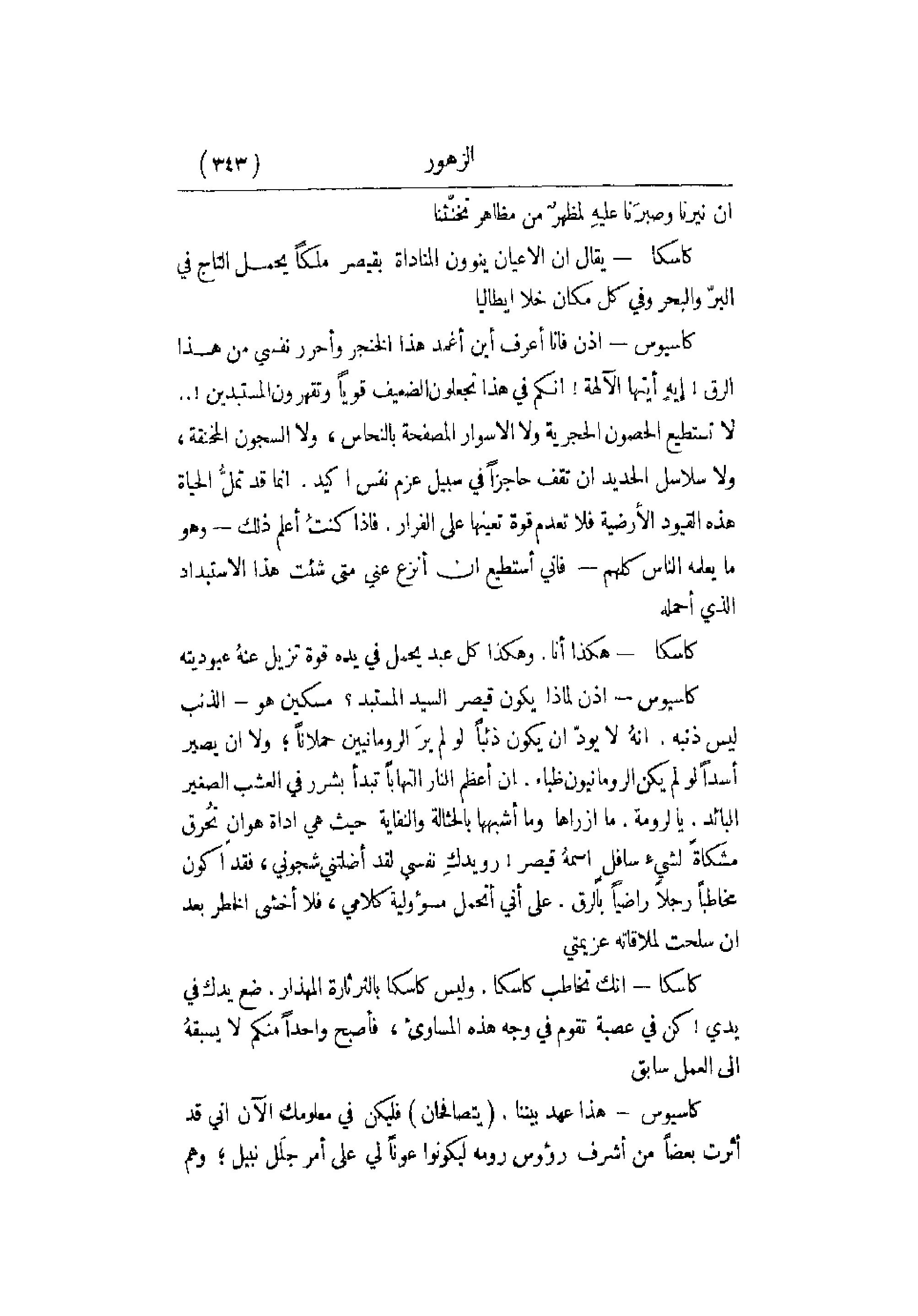 أشبهها بالحثالة والنفاية حيث هي أداة هوان تُحرق مشكاةً لشيءٍ سافلٍ اسمهُ قيصر! رويدكِ نفسي لقد أضلتني شجوني , فقد أكون مخاطباً رجلاً راضياً بالرق. على أني أتحمل مسؤولية كلامي , فلا أخشى الخطر بعد أن سلحت لملاقاته عزيمتي