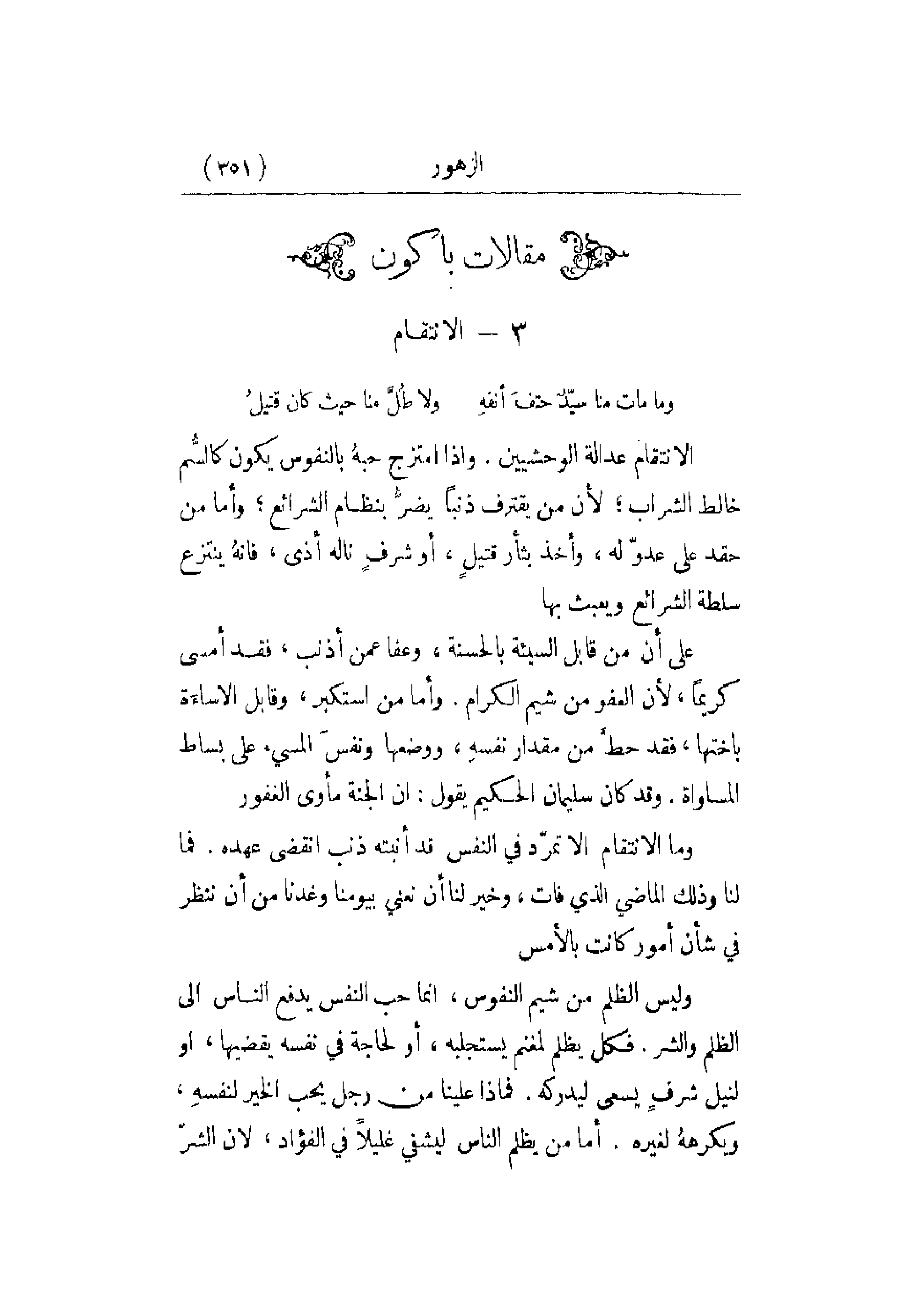الانتقام عدالة الوحشين. وإذا امتزج حبهُ بالنفوس يكون كالسُّم خالط الشراب؛ لأن من يقترف ذنباً يضرُّ بنظام الشرائع؛ وأما من حقد على عدوّ له , وأخذ بثأر قتيلٍ , أو شرفٍ ناله أذى , فإنهُ ينتزع سلطة الشرائع ويعبث بها. على أن من قابل السيئة بالحسنة , وعفا عمن أذنب , فقد أمسى كريماً , لأن العفو من شيم الكرام. وأما من استكبر , وقابل الإساءَة بأختها , فقد حطَّ من مقدار نفسهِ , ووضعها ونفسَ المسيء على بساط المساواة. وقد كان سليمان الحكيم يقول: إن الجنة مأوى الغفور. وما الانتقام إلا تمرّد في النفس قد أنبته ذنب انقضى عهده. فما لنا وذلك الماضي الذي فات , وخير لنا أن نعني بيومنا وغدنا من أن ننظر في شأن أمور كانت بالأمس. وليس الظلم من شيم النفوس , إنما حب النفس يدفع الناس إلى الظلم والشر. فكل يظلم لمغنم يستجلبه , أو لحاجة في نفسه يقضيها , أو لنيل شرفٍ يسعى ليدركه. فماذا علينا من رجل يحب الخير لنفسهِ , ويكرههُ لغيره. أما من يظلم الناس ليشفي غليلاً في الفؤاد , لأن الشرّ