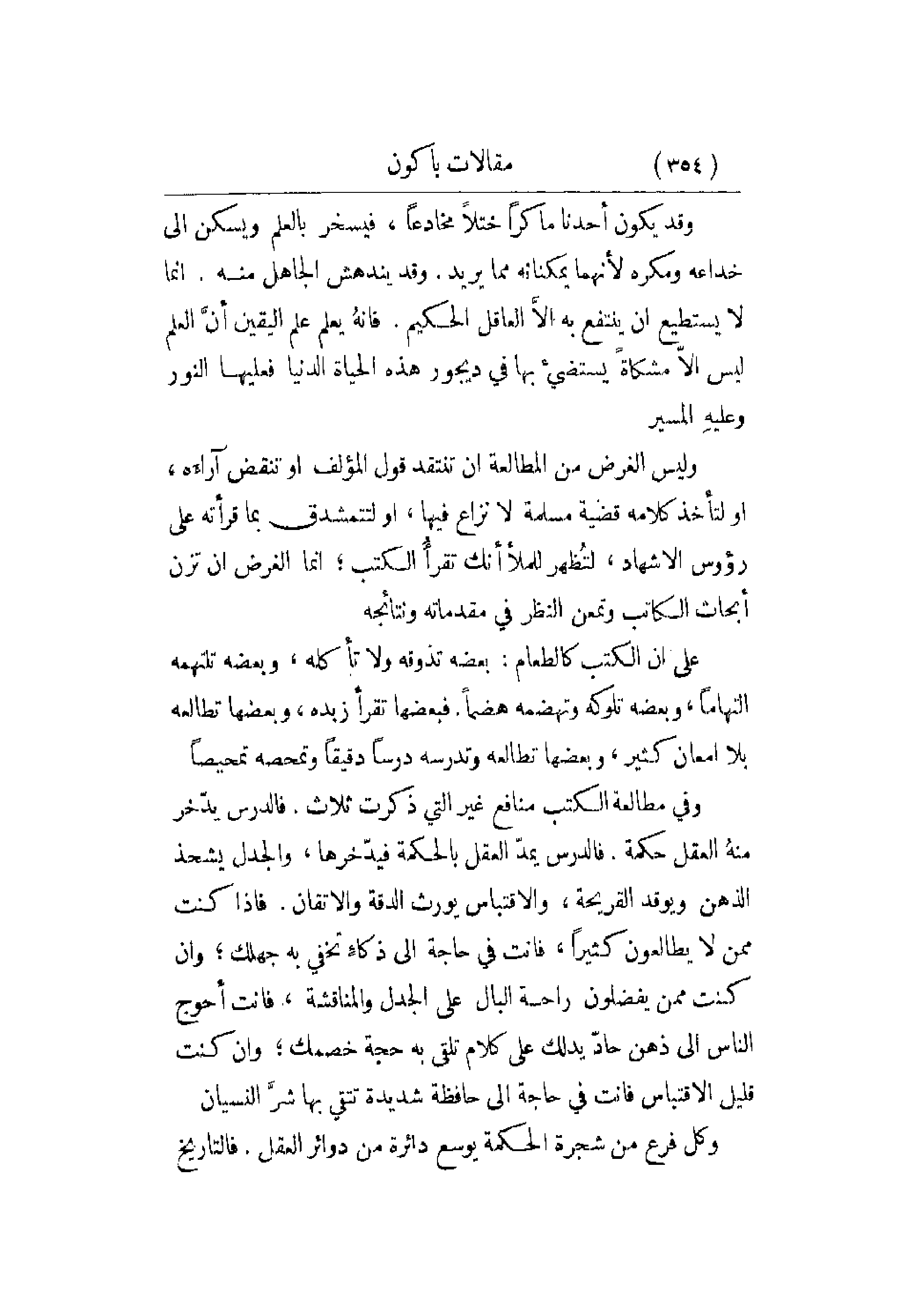 وقد يكون أحدنا ماكراً ختلاً مخادعاً , فيسخر بالعلم ويسكن إلى خداعه ومكره لأنهما يمكنانه مما يريد. وقد يندهش الجاهل منه. إنما لا يستطيع أن ينتفع به إلاَّ العاقل الحكيم. فإنه يعلم علم اليقين أنَّ العلم ليس إلاّ مشكاة يستضي بها في ديجور هذه الحياة الدنيا فعليها النور وعليهِ المسير. وليس الغرض من المطالعة أن تنتقد قول المؤلف أو تنقض آراءَه , أو لتأخذ كلامه قضية مسلمة لا نزاع فيها , أو لتتمشدق بما قرأته على رؤوس الإشهاد , لتظهر للملأ أنك تقرأُ الكتب؛ إنما الغرض أن تزن أبحاث الكاتب وتمعن النظر في مقدماته ونتائجه. على أن الكتب كالطعام: بعضه تذوقه ولا تأكله , وبعضه تلتهمه التهاماً , وبعضه تلوكه وتهضمه هضماً. فبعضها تقرأ زبده , وبعضها تطالعه بلا إمعان كثير , وبعضها تطالعه وتدرسه درساً دقيقاً وتمحصه تمحيصاً. وفي
