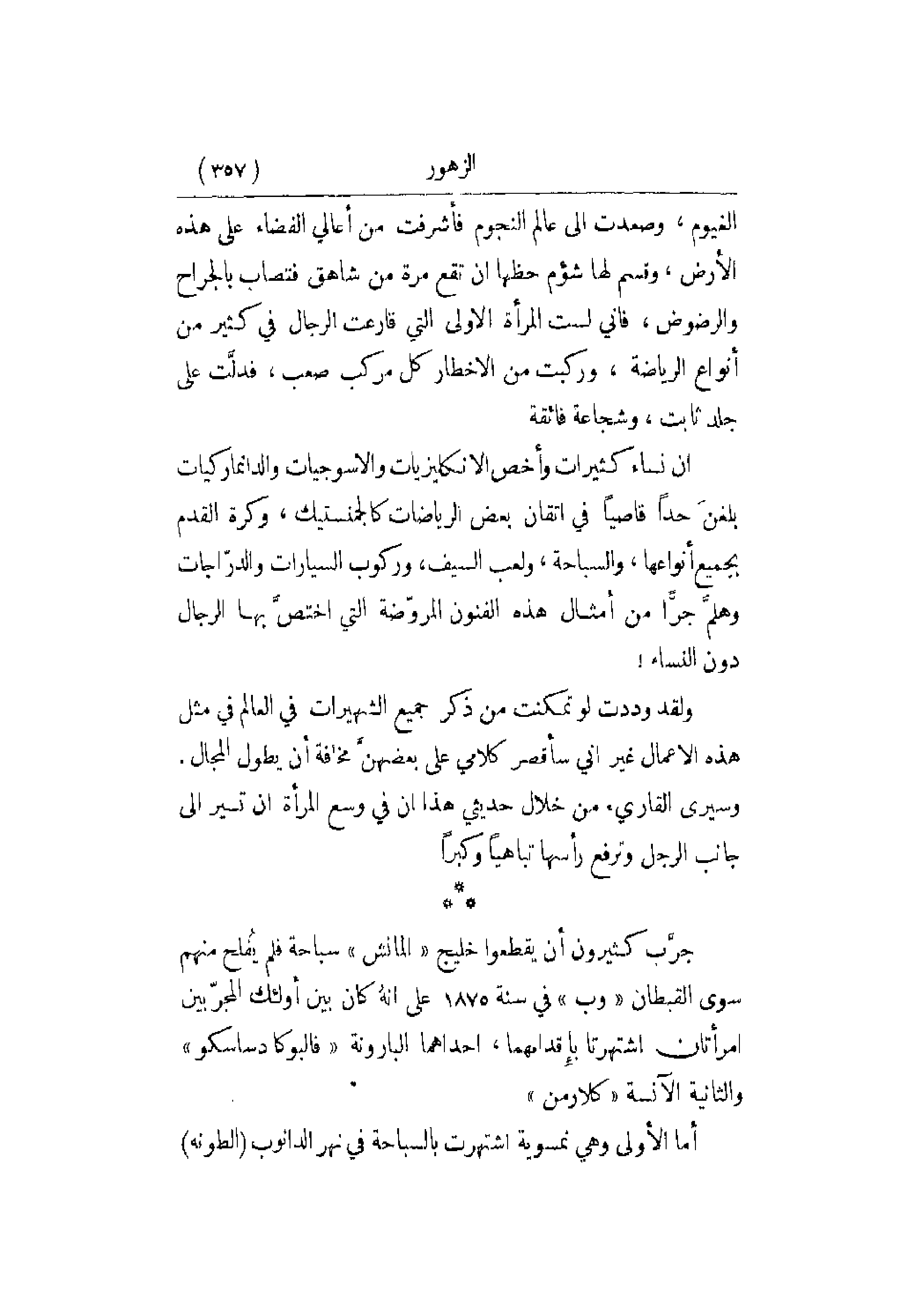 الغيوم , وصعدت إلى عالم النجوم فأشرقت من أعالي الفضاء على هذه الأرض , وقسم لها شؤم حظها أن تقع مرة من شاهق فتصاب بالجراح والرضوض , فإني لست المرأة الأولى التي قارعت الرجال في كثير من أنواع الرياضة , وركبت من الأخطار كل مركب صعب , فدلَّت على جلد ثابت , وشجاعة فائقة. إن نساء كثيرات وأخص الانكليزيات والأسوجيات والدانماركيات بلغنَ حداً قاصياً في إتقان بعض الرياضيات كالجمنستيك , وكرة القدم بجميع أنواعها , والسباحة , ولعب السيف , وركوب السيارات والدرّاجات وهلمَّ جرّاً من أمثال هذه الفنون المروّضة التي اختصَّ بها الرجال دون النساء!