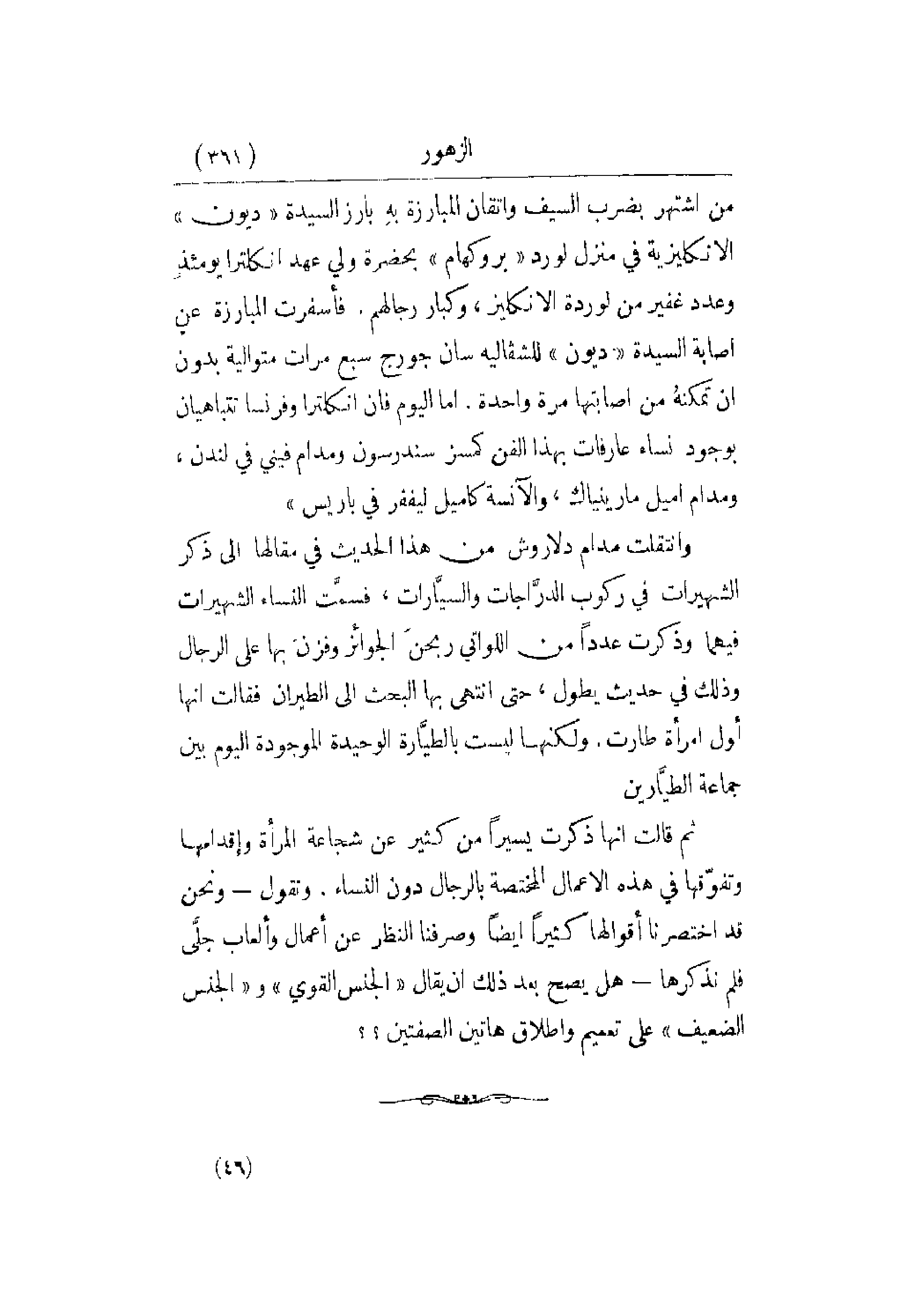 سان جورج سبع مرات متوالية بدون أن تمكنهُ من إصابتها مرة واحدة. أما اليوم فإن انكلترا وفرنسا تتباهيان بوجود نساء عارفات بهذا الفن كمسز سندرسون ومدام فيني في لندن , ومدام اميل مارينياك , والآنسة كاميل ليففر في باريس. وانتقلت مدام دلاروش من هذا الحديث في مقالها إلى ذكر الشهيرات في ركوب الدرَّاجات والسيَّارات , فسمَّت النساء الشهيرات فيهما وذكرت عدداً من اللواتي ربحنَ الجوائز وفزنَ بها على الرجال وذلك في حديث يطول , حتى انتهى بها البحث إلى الطيران فقالت أنها أول امرأة طارت. ولكنها ليست بالطيَّارة الوحيدة الموجودة اليوم بين جماعة الطيَّارين. ثم قالت أنها ذكرت يسيراً من كثير عن شجاعة المرأة وإقدامها وتفوّقها في هذه الأعمال بالرجال دون النساء. ونقول - ونحن قد اختصرنا أقوالها كثيراً أيضاً وصرفنا النظر عن أعمال وألعاب جلَّي فلم نذكرها - هل يصح بعد ذلك أن يقال الجنس القوي والجنس الضعيف على تعميم وإطلاق هاتين الصفتين؟؟