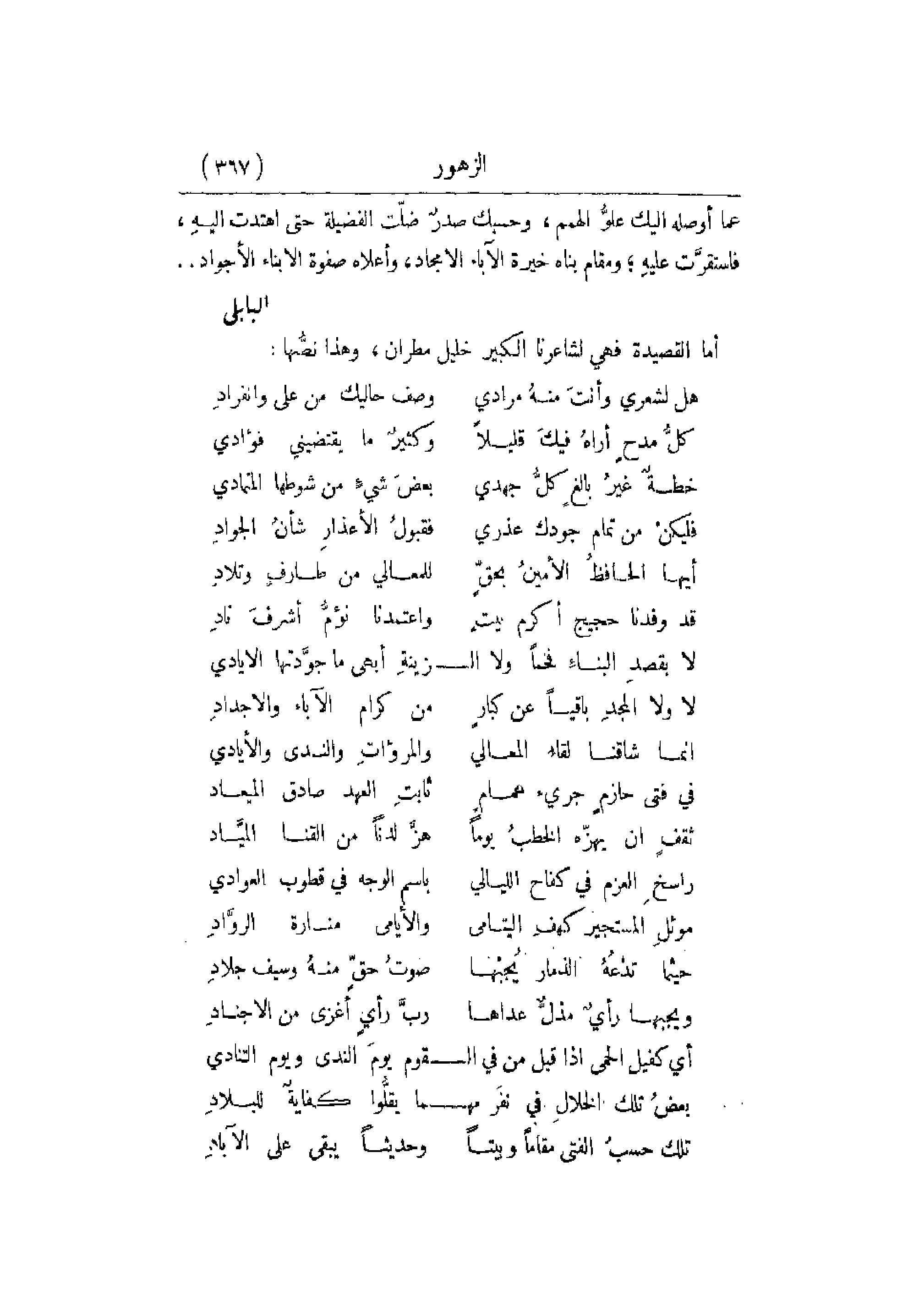 عما أوصله إليك علوُّ الهمم , وحسبك صدرٌ ضلّت الفضيلة حتى اهتدت إليهِ , فاستقرَّت عليهِ؛ ومقام بناه خيرة الآباء الأمجاد , وأعلاه صفوة الأبناء الأجواد. . .