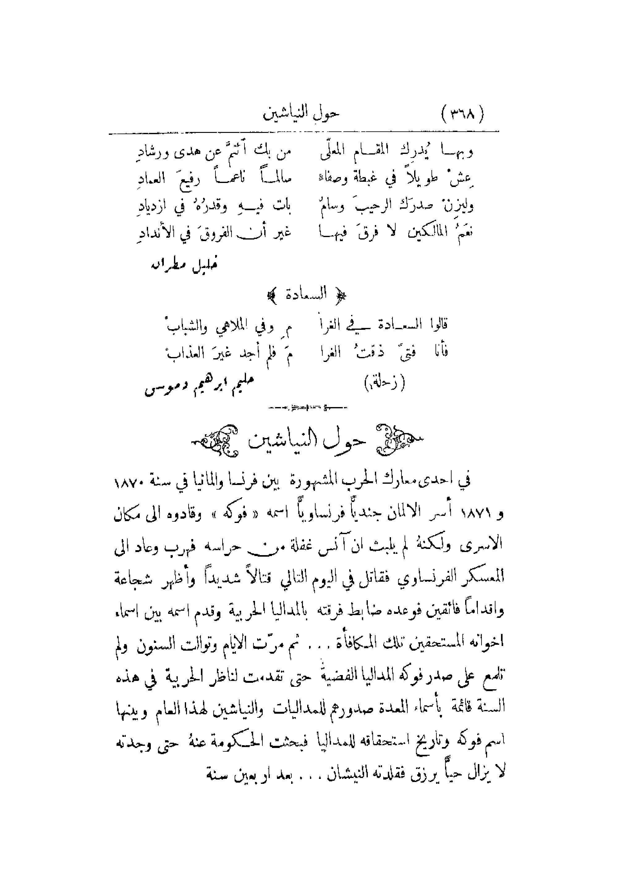في إحدى معارك الحرب المشهورة بين فرنسا وألمانيا في سنة 1870 و1871 أسر الألمان جنديّاً فرنساويّاً اسمه فوكه وقادوه إلى مكان الأسرى ولكنهُ لم يلبث أن آنس غفلة من حراسه فهرب وعاد إلى المعسكر الفرنساوي فقاتل في اليوم التالي قتالاً شديداً وأظهر شجاعة وإقداماً فائقين فوعد ضابط فرقته بالمداليا الحربية وقدم اسمه بين أسماء أخوانه المستحقين تلك المكافأة. . . ثم مرّت الأيام وتوالت السنون ولم تلمع على صدر فوكه المداليا الفضية حتى تقدمت لناظر الحربية في هذه السنة قائمة بأسماء المعدة صدورهم للمداليات والنياشين لهذا العام وبينها اسم فوكه وتاريخ استحقاقه للمداليا فبحثت الحكومة عنهُ حتى وجدته لا يزال حيّاً يرزق فقلدته النيشان. . . بعد أربعين سنة.