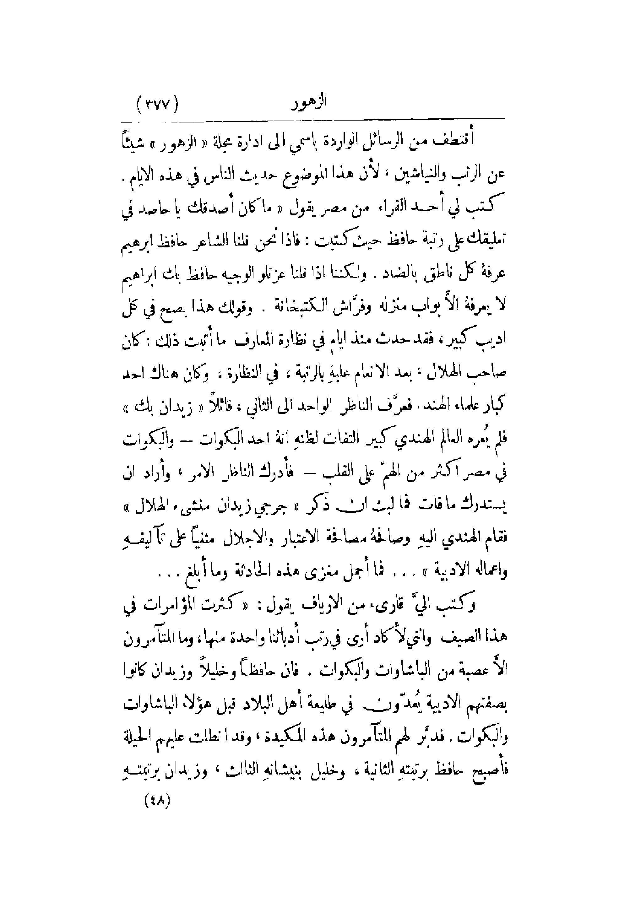 الاعتبار والإجلال مثنياً على تآليفهِ وأعماله الأدبية. . . فما أجمل مغزى هذه الحادثة وما أبلغ. . . وكتب إليَّ قارئ من الأرياف يقول: كثرت المؤامرات في هذا الصيف وإنني لأكاد أرى في رتب أدبائنا واحدة منها , وما المتآمرون إلاَّ عصبة من الباشاوات والبكوات. فإن حافظاً وخليلاً وزيدان كانوا بصفتهم الأدبية يُعدّون في طليعة أهل البلاد قبل هؤلاء الباشاوات والبكوات. فدبَّر لهم المتآمرون هذه المكيدة , وقد انطلقت عليهم الحيلة فأصبح حافظ برتبتهِ الثانية , وخليل بنيشانهِ الثالث , وزيدان برتبتهِ