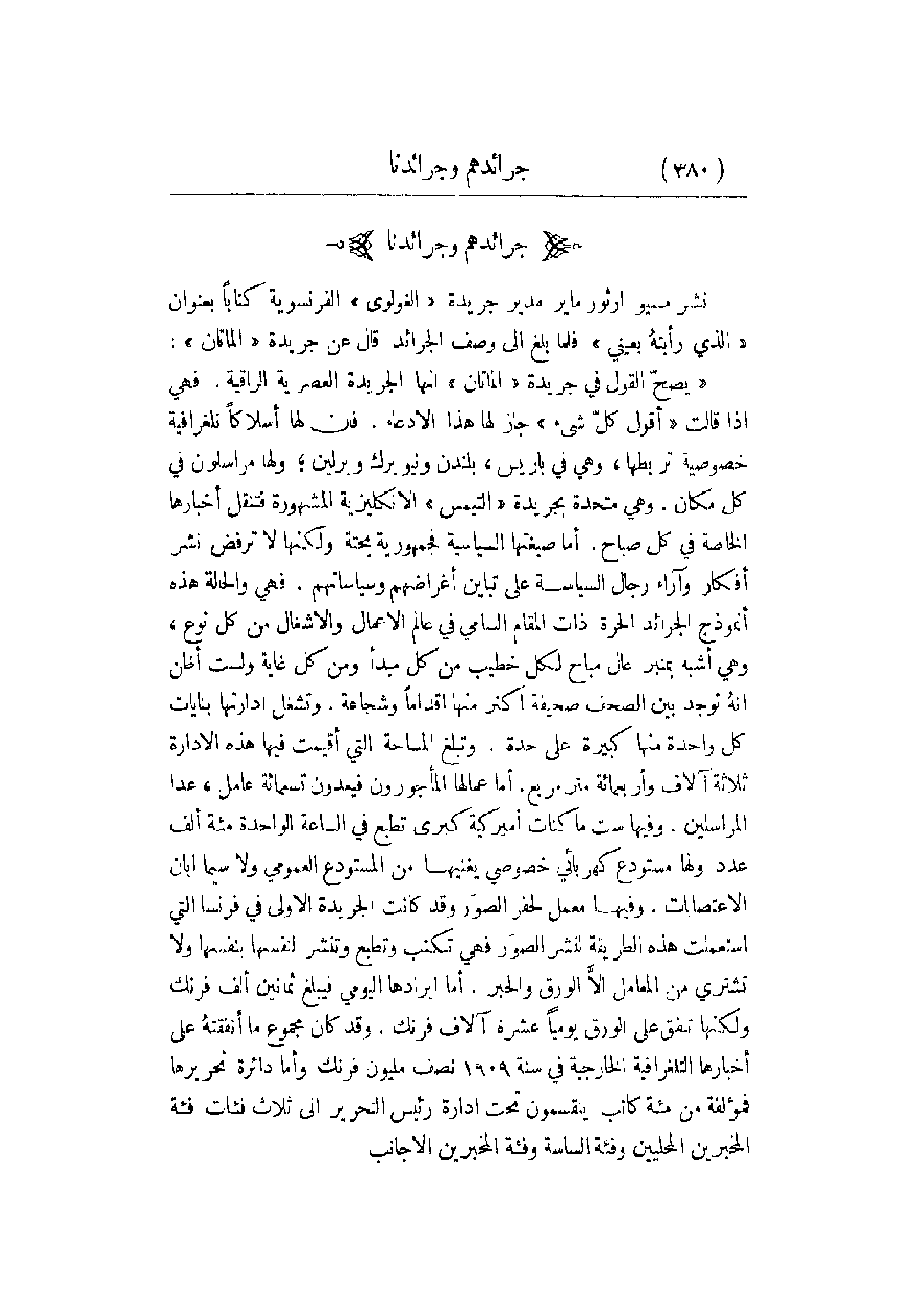 نشر مسيو ارثور ماير مدير جريدة الغولوى الفرنسوية كتاباً بعنوان الذي رأيتهُ بعيني فلما بلغ إلى وصف الجرائد قال عن جريدة الماتن: يصحّ القول في جريدة الماتان أنها الجريدة العصرية الراقية. فهي إذا قالت أقول كلّ شيء جاز لها هذا الإدعاء , فإن لها أسلاكاً تلغرافية خصوصية تربطها , وهي في باريس , بلندن ونيويرك وبرلين؛ ولها مراسلون في كل مكان. وهي متحدة بجريدة التيمس الانكليزية المشهورة فتنقل أخبارها الخاصة في كل صباح. أما صبغتها السياسية فجمهورية بحتة ولكنها لا ترفض نشر أفكار وآراء رجال السياسية على تباين أغراضهم وسياساتهم. فهي والحالة هذه أنموذج الجرائد الحرة ذات المقام السامي في عالم الأعمال والأشغال من كل نوع , وهي أشبه بمنبر عال مباح لكل خطيب من كل مبدأ ومن كل غاية ولست أظن أنهُ توجد بين الصحف صحيفة أكثر منها إقداماً وشجاعة. وتشغل إدارتها بنايات كل واحدة منها كبيرة على حدة. وتبلغ المساحة التي أقيمت فيها هذه الإدارة ثلاثة آلاف وأربعمائة متر مربع. أما عمالها المأجورون فيعدون تسعمائة عامل , عدا المراسلين. وفيها ست ماكنات أميركية كبرى تطبع في الساعة الواحدة مئة ألف عدد ولها مستودع كهربائي خصوصي يغنيها من المستودع العمومي ولاسيما أبان الاعتصابات. وفيها معمل لحفر الصوَر فهي تكتب وتطبع وتنشر لنفسها بنفسها ةلا تشتري من المعامل إلاَّ الورق والحبر. أما إيرادها اليومي فيبلغ ثمانين ألف فرنك ولكنها تنفق على الورق يومياً عشرة آلاف فرنك. وقد كان مجموع ما أنفقتهُ على أخبارها التلغرافية الخارجية في سنة 1909 نصف مليون فرنك وأما دائرة تحريرها فمؤلفة من مئة كاتب ينقسمون تحت إدارة رئيس التحرير إلى ثلاث فئات فئة المخبرين المحليين وفئة المخبرين الأجانب.