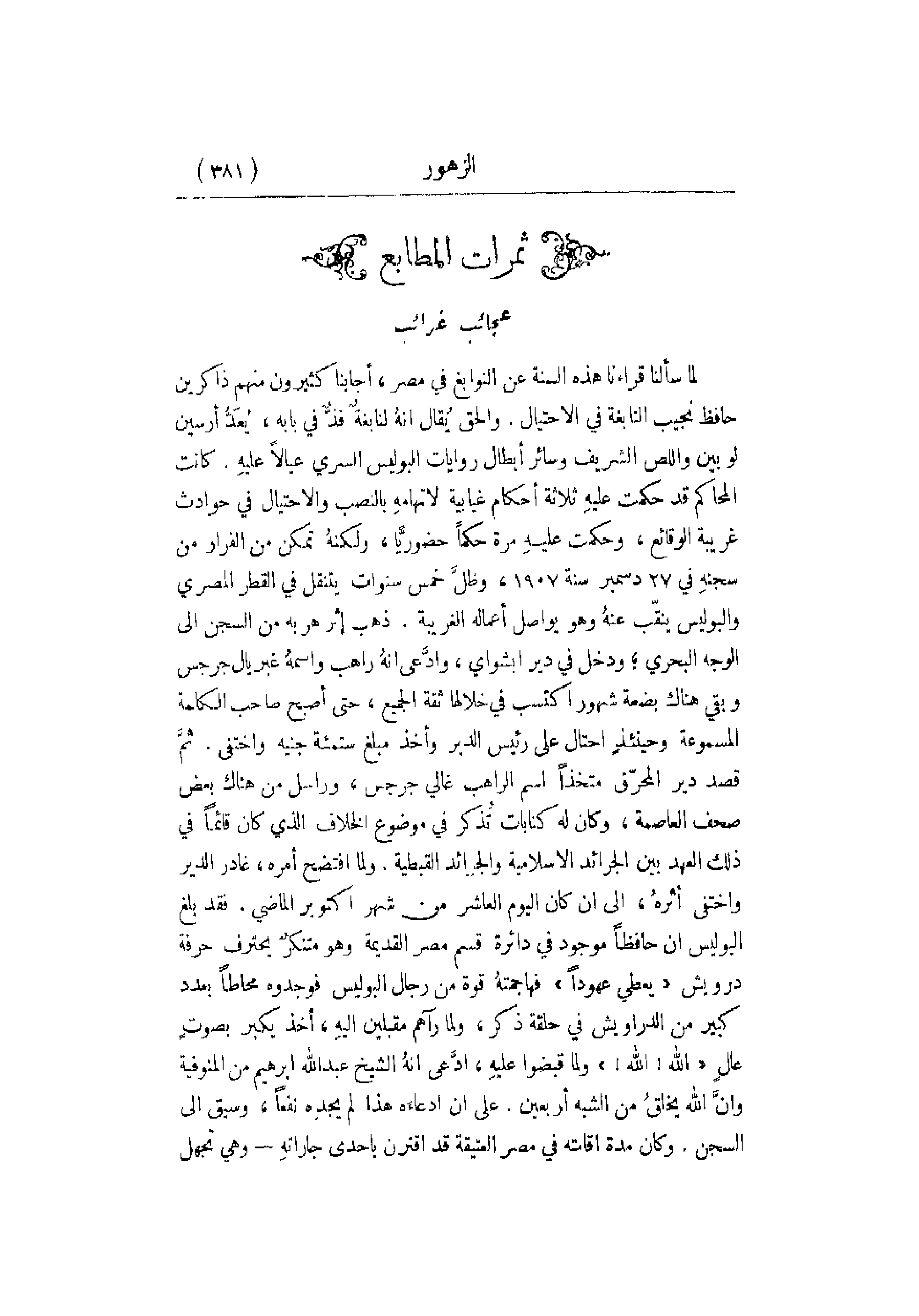 لما سألنا قراءنا هذه السنة عن النوابغ في مصر , أجابنا كثيرون منهم ذاكرين حافظ نجيب النابغة في الاحتيال. والحق يُقال أنهُ لنابغةٌ فذٌّ في بابهِ , يُعَدُّ أرسين لوبين واللص الشريف وسائر أبطال روايات البوليس السري عيالاً عليهِ. كانت المحاكم قد حكمت عليهِ ثلاثة أحكام غيابية لاتهامهِ بالنصب والاحتيال في حوادث غريبة الوقائع , وحكمت عليهِ مرة حكماً حضوريّاً , ولكنهُ تمكن من الفرار من سجنهِ في 27 دسمبر سنة 1907 , وظلَّ خمس سنوات يتنقل في القطر المصري والبوليس ينقّب عنُ وهو يواصل أعماله الغريبة. ذهب إثر هربه من السجن إلى الوجه البحري؛ ودخل في دير أشواري , وادَّعى أنهُ راهب واسمهُ غبريال جرجس وبقي هناك بضعة شهور اكتسب في خلالها ثقة الجميع , حتى أصبح صاحب الكلمة المسموعة وحينئذٍ احتال على رئيس الدير وأخذ مبلغ ستمئة جنيه واختفى. ثمَّ قصد دير المحرّق متخذاً اسم الراهب غالي جرجس , وراسل من هناك بعض صحف العاصمة , وكان له كتابات تُذكر في موضوع الخلاف الذي كان قائماً في ذلك العهد بين الجرائد الإسلامية والجرائد القبطية. ولما افتضح أمره , غادر الدير واختفى أثرهُ , إلى أن كان اليوم العاشر من شهر أكتوبر الماضي. فقد بلغ البوليس أن حافظاً موجود في دائرة قسم مصر القديمة وهو متنكرٌ يحترف حرفة درويش يعطي عهوداً فهاجمتهُ قوة من رجال البوليس فوجدوه محاطاً بعدد كبير من الدراويش في حلقة ذكر , ولما رآهم مقبلين إليهِ , أخذ يكبر بصوتٍ عالٍ الله! الله! ولما قبضوا عليهِ , ادَّعى أنهُ الشيخ عبد الله إبراهيم من المنوفية وأنَّ الله يخلقُ من الشبه أربعين. على أنا إدعاءَه هذا لم يجده نفعاً , وسيق إلى السجن. وكان مدة إقامته في مصر العتيقة قد اقترن بإحدى جاراتهِ - وهي تجهل