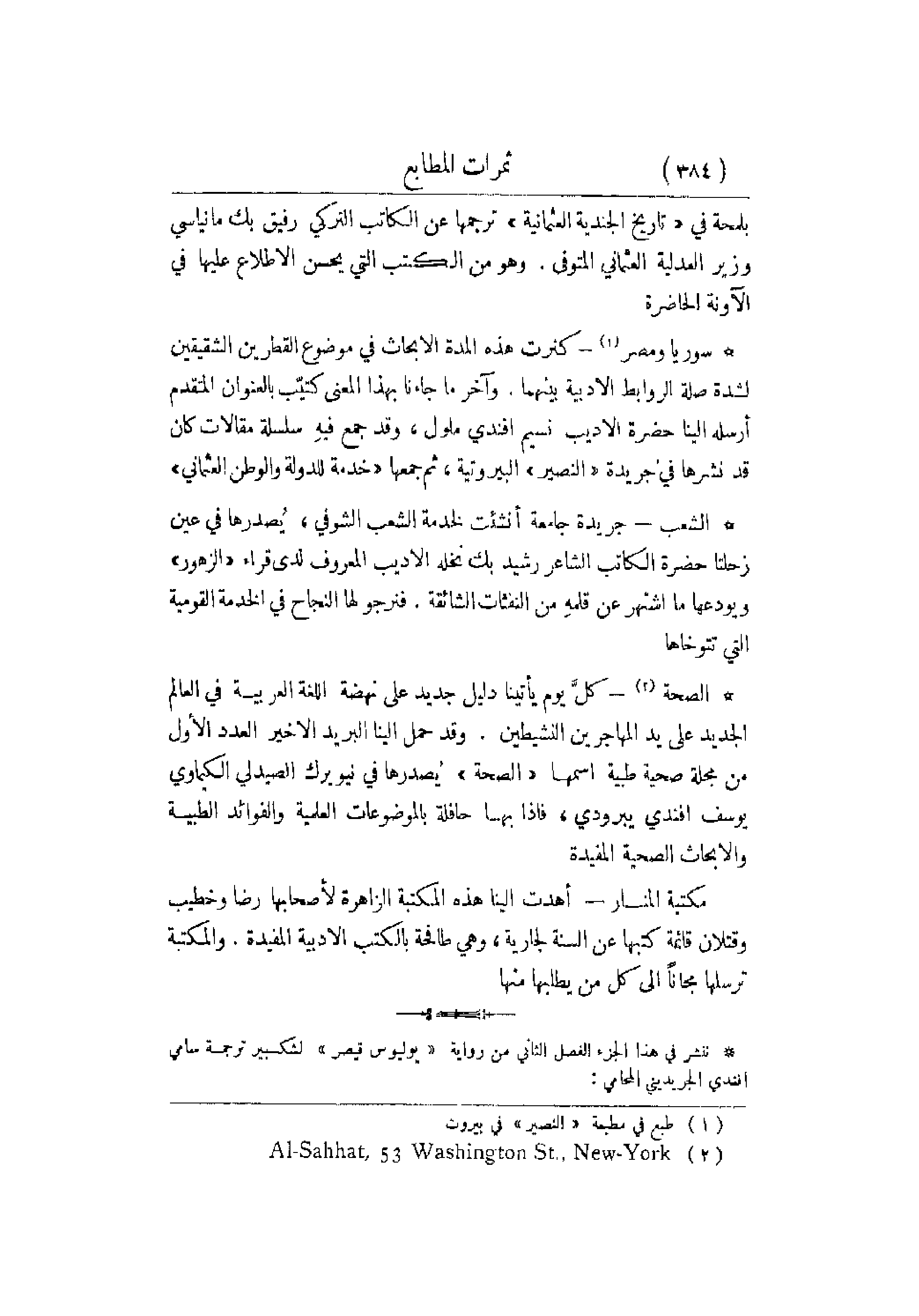 سوريا ومصر - كثرت هذه المدة الأبحاث في موضوع القطرين الشقيقين لشدة صلة الروابط الأدبية بينهما. وآخر ما جاءنا بهذا المعنى كتيّب بالعنوان المتقدم أرسله إلينا حضرة الأديب نسيم أفندي ملول , وقد جمع فيهِ سلسلة مقالات كان قد نشرها في جريدة النصير البيروتية , ثم جمعها خدمة للدولة والوطن العثماني.