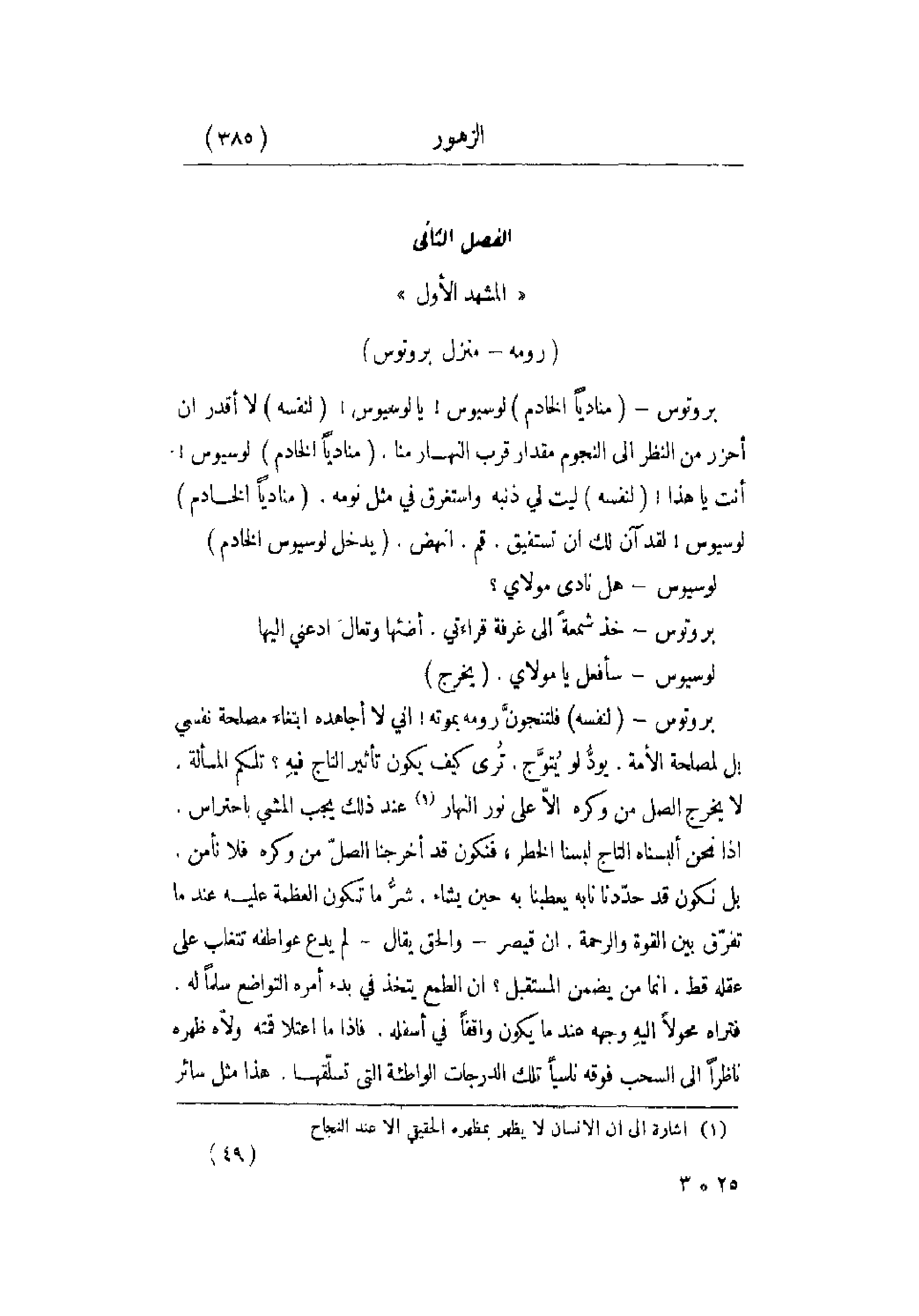 بروتوس - لنفسه فلتنجونَّ رومه بموته! إني لا أجاهده ابتغاءَ مصلحة نفسي بل لمصلحة الأمة. يودُّ يُتوَّج. تُرى كيف يكون تأثير التاج فيهِ؟ تلكم المسألة. لا يخرج الصل من وكره إلاّ على نور النهار عند ذلك يجب المشي باحتراس. إذا نحن ألبسناه التاج لبسنا الخطر , فنكون قد أخرجنا الصلّ من وكره فلا نأمن. بل نكون قد حدّدنا نابه يعطينا به حين يشاء. شرُّ ما تكون العظمة عليه عندما تفرّق بين القوة والرحمة. إن قيصر - والحق يقال - لم يدع عواطفه تتغلب على عقله قط. إنما من يضمن المستقبل؟ إن الطمع يتخذ في بدء أمره التواضع سلماً له. فتراه محولاً إليهِ وجهه عندما يكون واقفاً في أسفله. فإذا ما اعتلا قمته ولاّه ظهره ناظراً إلى السحب فوقه ناسياً تلك الدرجات الواطئة التي تسلّقها. هذا مثل سائر