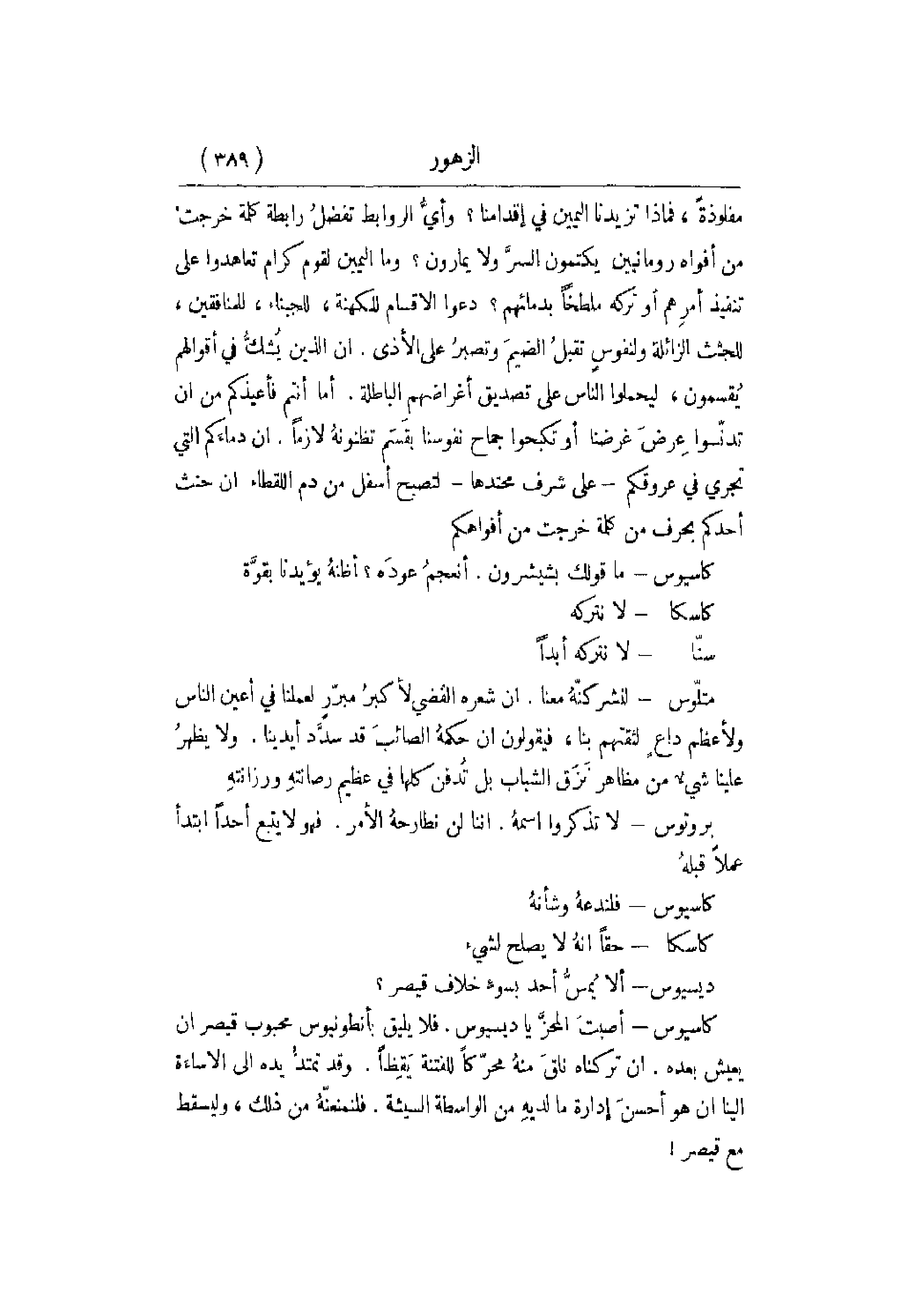 مفلوذةً , فماذا تزيدنا اليمين في إقدامنا؟ وأيُّ الروابط تفضلُ رابطة كلمة خرجت من أفواه رومانيين يكتمون السرَّ ولا يمارون؟ وما اليمين لقوم كرام تعاهدوا على تنفيذ أمرِهم أو تركه ملطخاً بدمائهم؟ دعوا الأقسام للكهنة , للجبناء , للمنافقين , للجثث الزائلة ولنفوسٍ تقبلُ الضيمَ وتصبرُ على الأذى. أن الذين يُشكُّ في أقوالهم يُقسمون , ليحملوا الناس على تصديق أغراضهم الباطلة. أما أنتم فأعيذكم من أن تدنّسوا عِرضَ غرضنا أو تكبحوا جماح نفوسنا بقَسَم تظنونهُ لازماً. إن دماءَكم التي تجري في عروقكم - على شرف محتدها - لتصبح أسفل من دم اللقطاء إن حنث أحدكم بحرف من كلمة خرجت من أفواهكم.