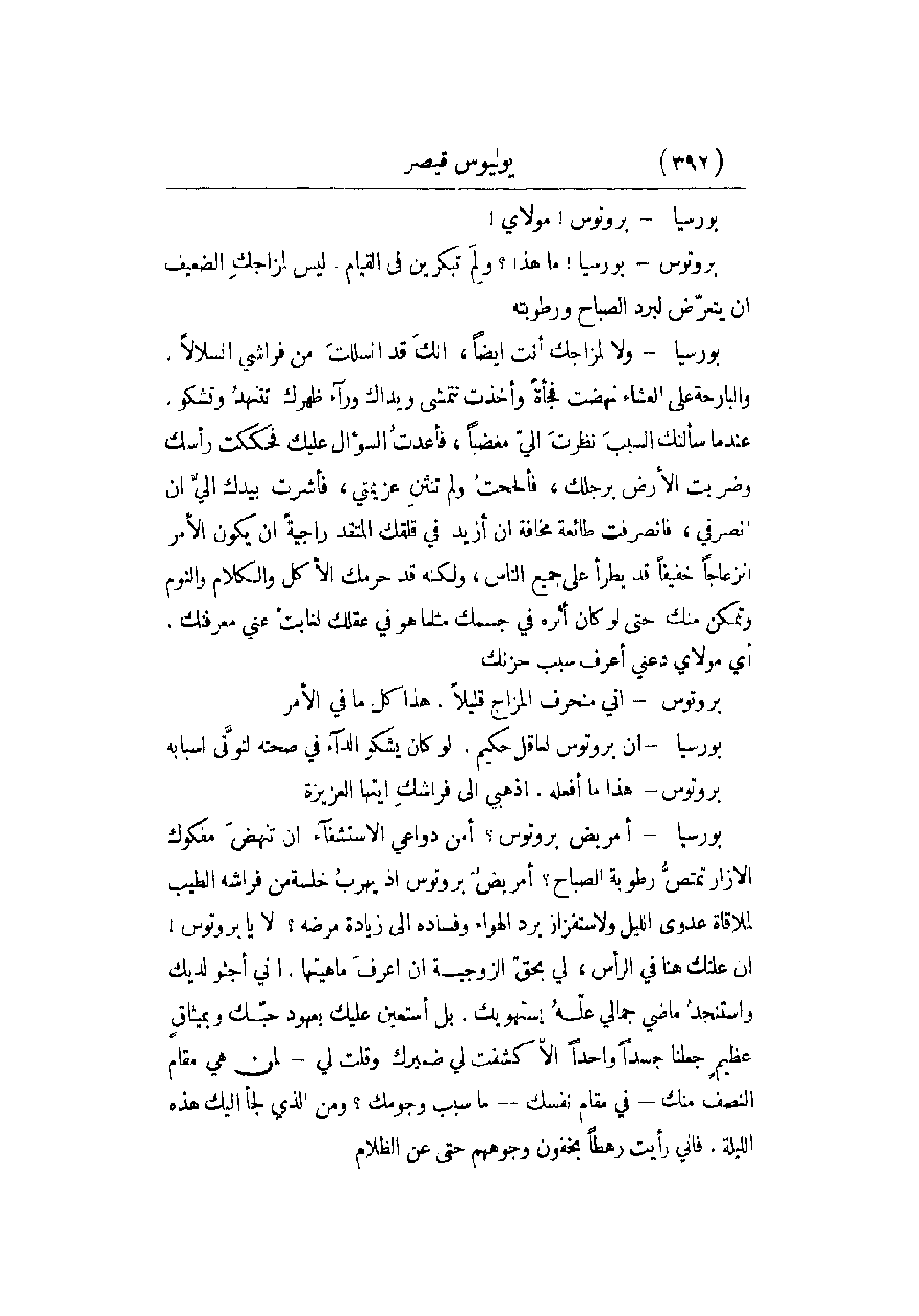 رطوبة الصباح؟ أمريضٌ بروتوس إذ يهربُ خلسة من فراشه الطيب لملاقاة عدوى الليل ولاستفزاز برد الهواء وفساده إلى زيادة مرضه؟ لا يا بروتوس! إن علتك هنا في الرأس , لي بحقّ الزوجية أن أعرفَ ماهيتها. . إني أجثو لديك واستنجدُ ماضي جمالي علّهُ يستهويك. بل أستعين عليك بعهود حبّك وبميثاق عظيمٍ جعلنا جسداً واحداً إلاّ كشفت لي ضميرك وقلت لي - لمن هي مقام النصف منك - في مقام نفسك - ما سبب وجومك؟ ومن الذي لجأ إليك هذه الليلة. فإني رأيت رهطاً يخفون وجوههم حتى عن الظلام.
