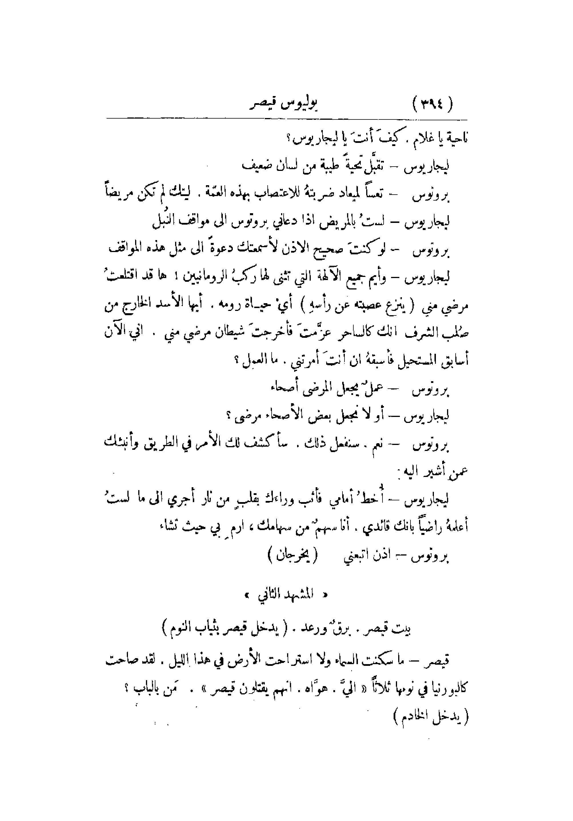 بروتوس - لو كنتَ صحيح الأذن التي تثني لها ركبُ الرومانيين! ها قد اقتلعتُ مرضي مني ينزع عصبته عن رأسهِ أيْ حياة رومه. أيها الأسد الخارج من صُلب الشرف إنك كالساحر عزَّمتَ فأخرجتَ شيطان مرضي مني. إني الآن أسابق المستحيل فأسبقهُ إن أنتَ أمرتني. ما العمل؟