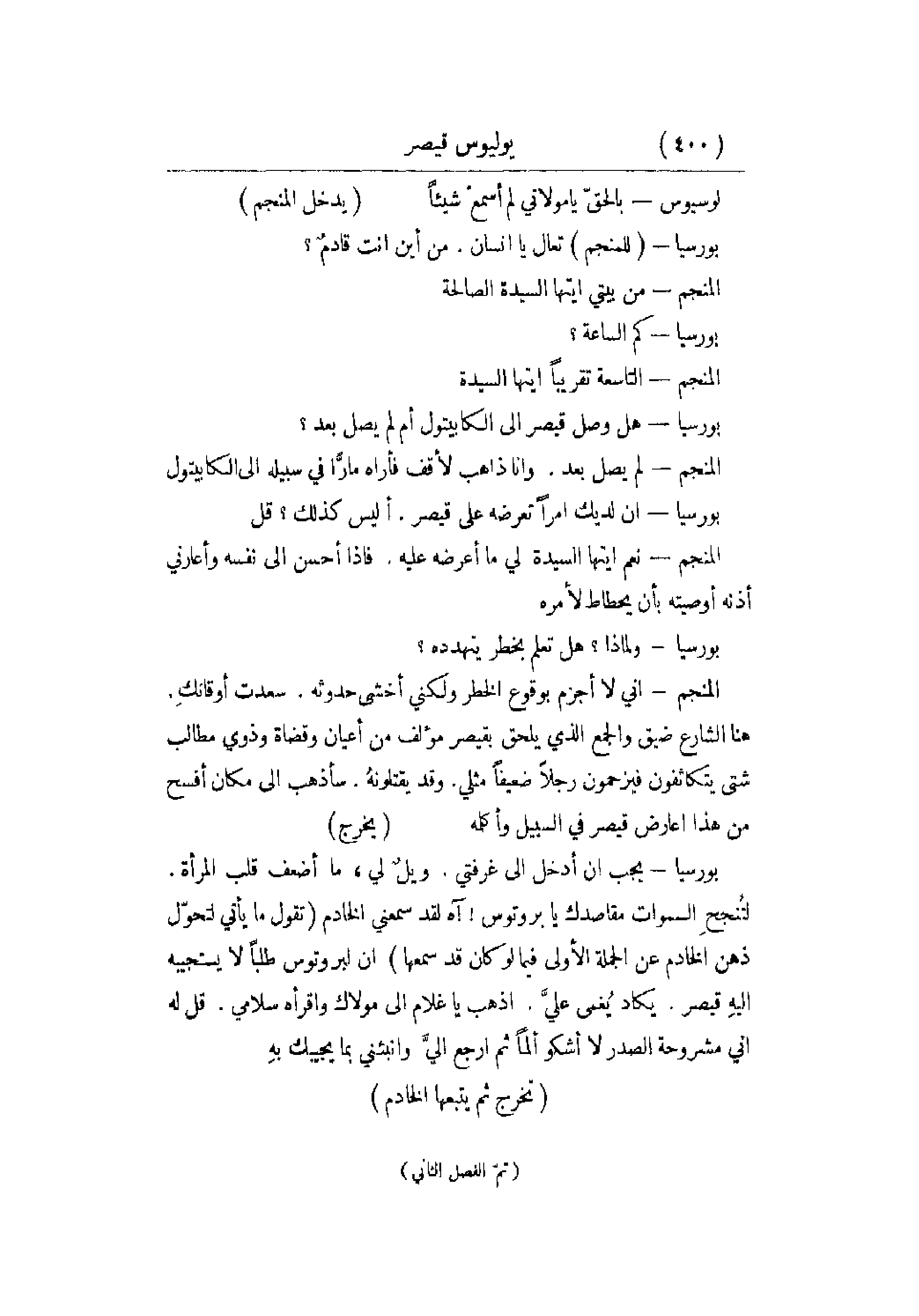 المنجم - إني لا أجزم بوقوع الخطر ولكني أخشى حدوثه. سعدت أوقاتكِ. هنا الشارع ضيق والجمع الذي يلحق بقيصر مؤلف من أعيان وقضاة وذوي مطالب شتى يتكاثفون فيزحمون رجلاً ضعيفاً مثلي. وقد يقتلونهُ. سأذهب إلى مكان أفسح من هذا أعارض قيصر في السبيل وأكمله يخرج