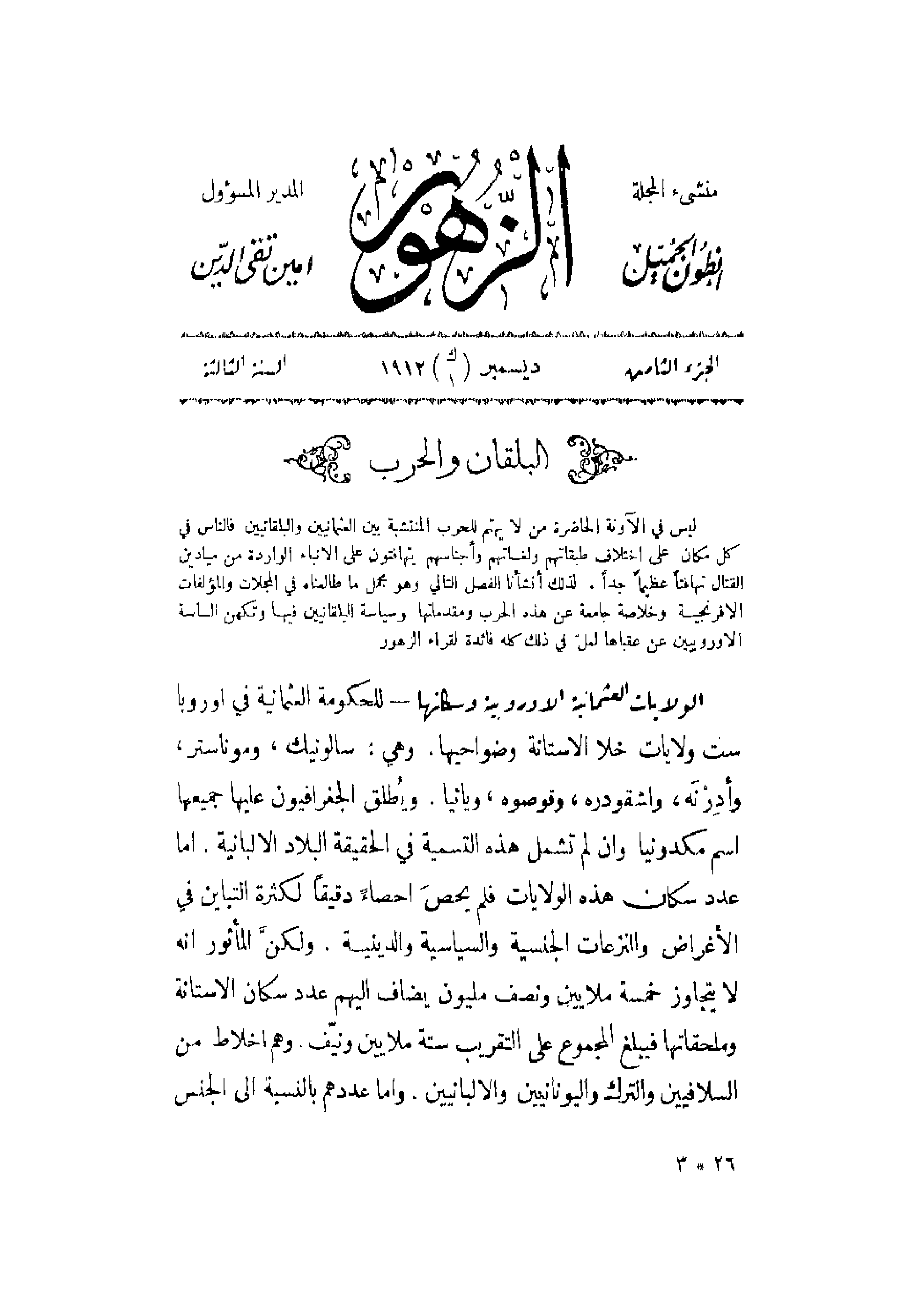 ليس في الآونة الحاضرة من لا يهتم للحرب المنتشبة بين العثمانيين والبلقانيين فالناس في كل مكان على اختلاف طبقاتهم ولغاتهم وأجناسهم يتهافتون على الأنباء الواردة من ميادين القتال تهافتاً عظيماً جداً. لذلك أنشأنا الفصل التالي وهو مجمل ما طالعناه في المجلات والمؤلفات الإفرنجية وخلاصة جامعة عن هذه الحرب ومقدماتها وسياسة البلقانيين فيها وتكهن الساسة الأوروبيين عن عقباها لعلّ في ذلك كله فائدة لقراء الزهور.