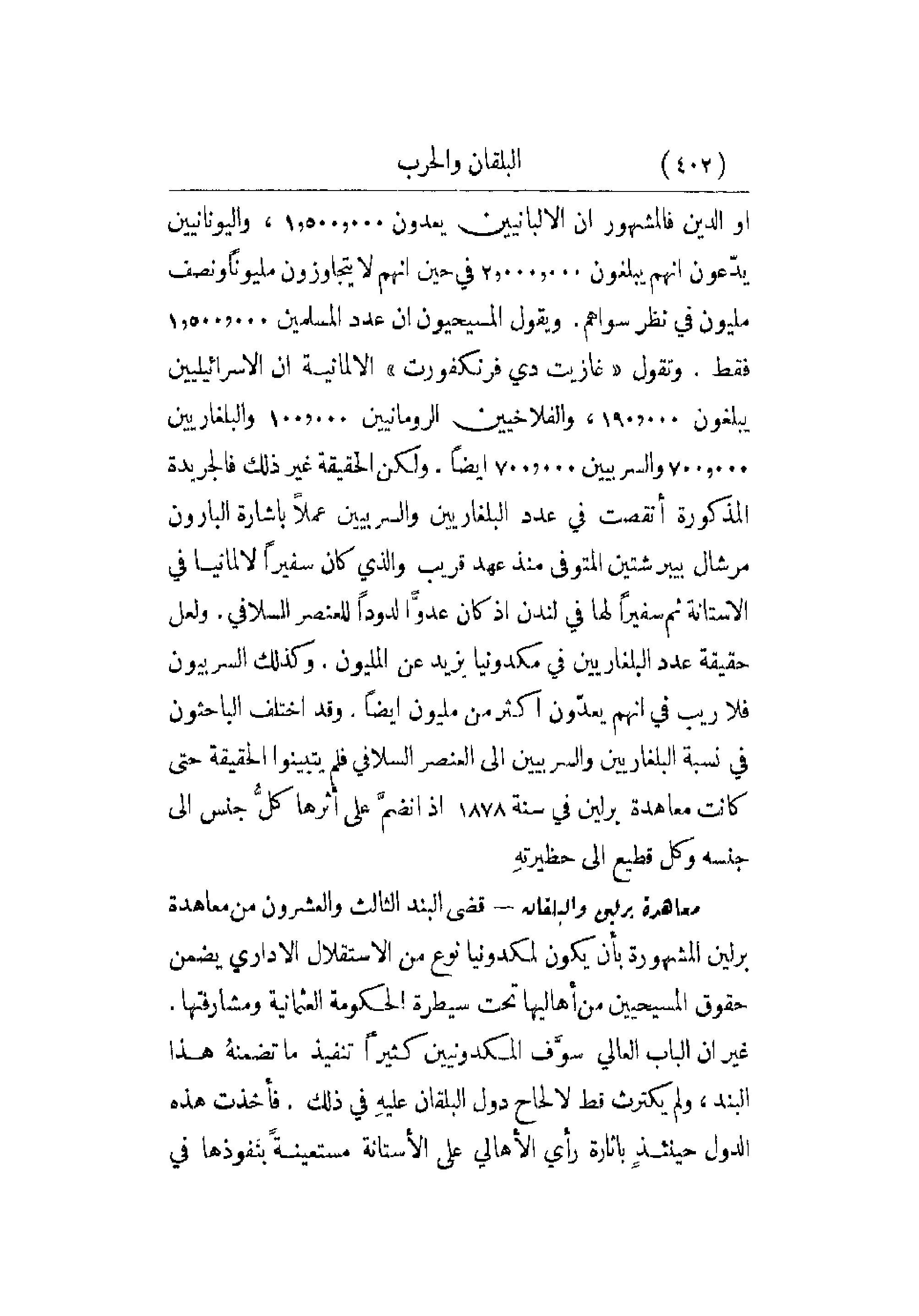 أو الدين فالمشهور أن الألبانيين يعدون 1. 500. 000 , واليونانيين يدّعون أنهم يبلغون 2. 000. 000 في حين أنهم لا يتجاوزون مليوناً ونصف مليون في نظر سواهم. ويقول المسيحيون أن عدد المسلمين 1. 500. 000 فقط. وتقول غايت دي فرنكفورت الألمانية أن الإسرائيليين يبلغون 190. 000 , والفلاخيين الرومانيين 100. 000 والبلغاريين 700. 000 والسربيين 700. 000 أيضاً. ولكن الحقيقة غير ذلك فالجريدة المذكورة أنقصت في عدد البلغاريين والسربيين عملاً بإشارة البارون مرشال بيبرشتين المتوفي منذ عهد قريب والذي كان سفيراً لألمانيا في الآستانة ثم سفيراً لها في لندن إذ كان عدوّاً لدوداً للعنصر السلافي. ولعل حقيقة عدد البلغاريين في مكدونيا يزيد عن المليون. وكذلك السربيون فلا ريب في إنهم يعدّون أكثر من مليون أيضاً. وقد اختلف الباحثون في نسبة البلغاريين والسربيين إلأى العنصر السلافي فلم يتبينوا الحقيقة حتى كانت معاهدة برلين في سنة 1878 إذ انضمَّ على أثرها كلُّ جنس إلى جنسه وكل قطيع إلى حظيرتهِ.