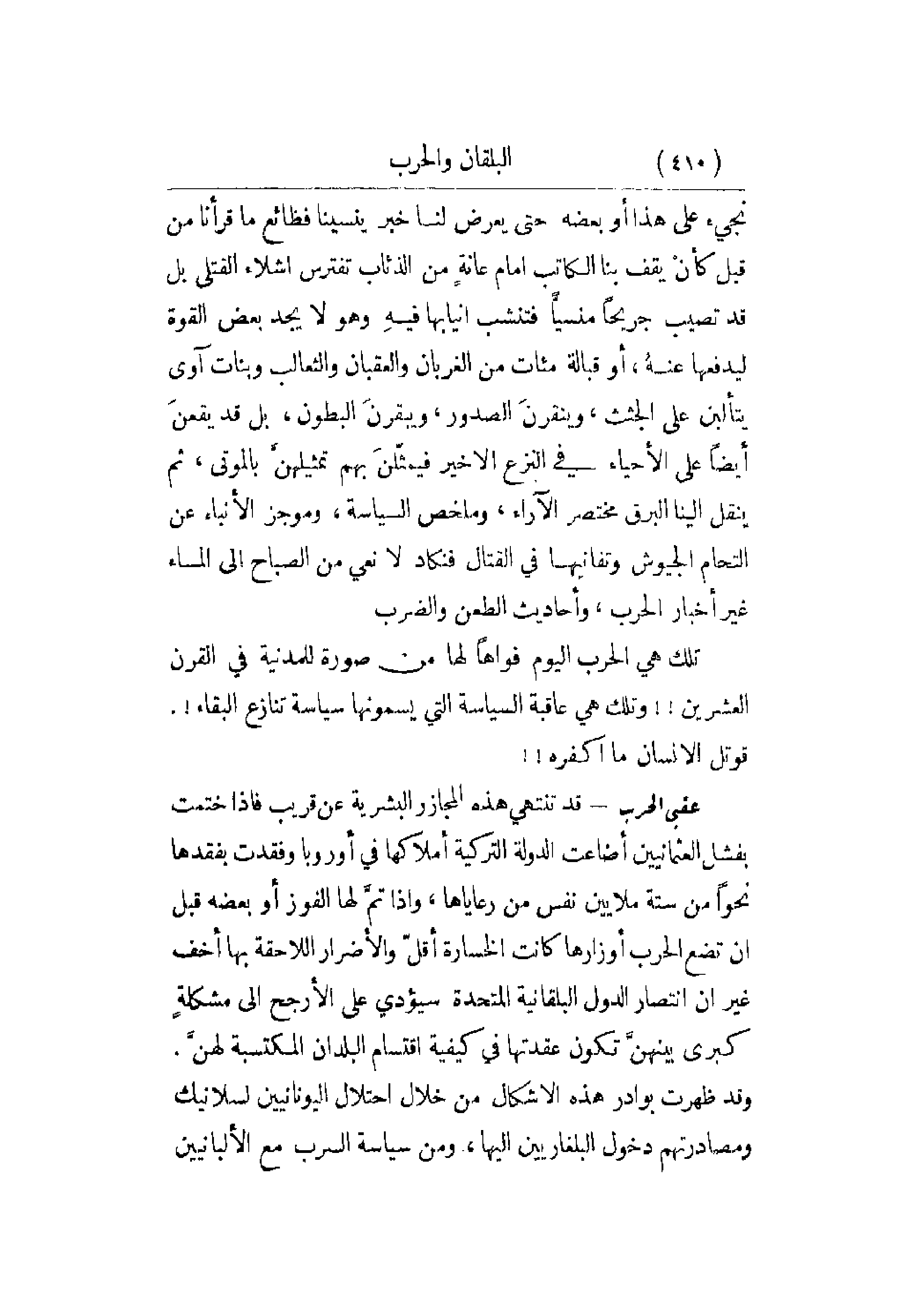 نجيء على هذا أو بعضه حتى يعرض لنا خبر ينسينا فظائع ما قرأنا من قبل كأن يقف بنا الكاتب أمام عانةٍ من الذئاب تفترس أشلاء القتلى بل قد تصيب جريحاً منسياً فتنشب أنيابها فيهِ وهو لا يجد بعض القوة ليدفعها عنهُ , أو قبالة مئات من الغربان والعقبان والثعالب وبنات آوى يتألبن على الجثث , وينقرنَ الصدور , ويبقرنَ البطون , بل قد يقعنَ أيضاً على الأحياء في النزع الأخير فيمثّلن بهم تمثيلهنَّ بالموتى , ثم ينقل إلينا البرق مختصر الآراء , وملخص السياسة , وموجز الأنباء عن التحام الجيوش وتفانيها في القتال فنكاد لا نعي من الصباح إلى المساء غير أخبار الحرب , وأحاديث الطعن والضرب. تلك هي الحرب اليوم فواهاً لها من صورة للمدنية في القرن العشرين!! وتلك هي عاقبة السياسة التي يسمونها سياسة تنازع البقاء!. قوتل الإنسان ما أكفره!!