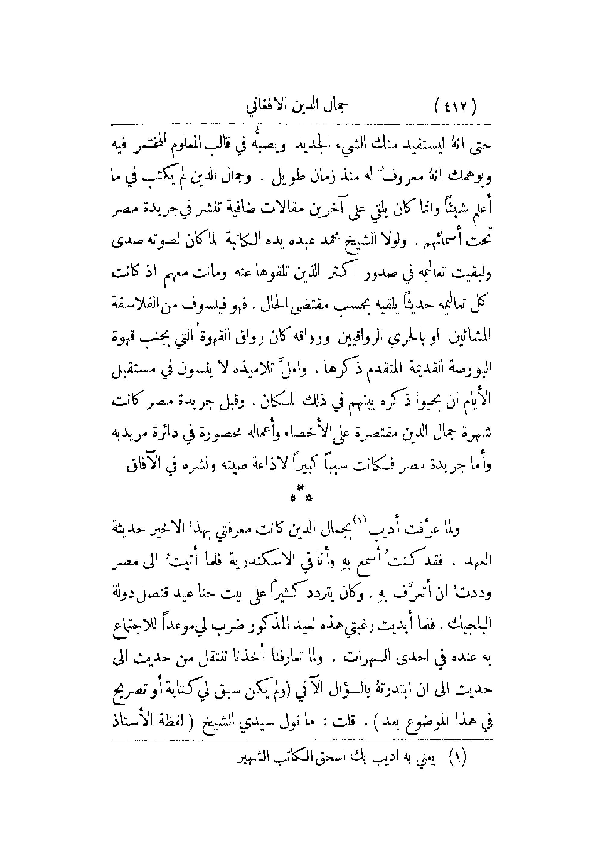 حتى أنهُ ليستفيد منك الشيء الجديد ويصبهُ في قالب المعلوم المختمر فيه ويوهمك أنهُ معروفٌ له منذ زمان طويل. وجمال الدين لم يكتب في ما أعلم شيئاً وإنما كان يلقي على آخرين مقالات ضافية تنشر في جريدة مصر تحت أسمائهم. ولولا الشيخ محمد عبده يده الكاتبة لما كان لصوته صدى ولبقيت تعاليمه في صدور أكثر الذين تلقوها عنه وماتت معهم إذ كانت كل تعاليمه حديثاً يلقيه بحسب مقتضى الحال. فهو فيلسوف من الفلاسفة المشائين أو بالجري الرواقيين ورواقه كان رواق القهوة التي بجنب قهوة البورصة القديمة المتقدم ذكرها. ولعلَّ تلاميذه لا ينسون في مستقبل الأيام إن يحيوا ذكره بينهم في ذلك المكان. وقبل جريدة مصر كانت شهرة جمال الدين مقتصرة على الأخصاء وأعماله محصورة في دائرة مريديه وأما جريدة مصر فكانت سبباً كبيراً لإذاعة صيته ونشره في الآفاق. ولما عرَّفت أديب بجمال الدين كانت معرفتي بهذا الأخير حديثة العهد. فقد كنتُ أسمع بهِ وأنا في الإسكندرية فلما أتيتُ إلى مصر وددتُ أن أتعرَّف بهِ. وكان يتردد كثيراً على بيت حنا عيد قنصل دولة البلجيك. فلما أبديت رغبتي هذه لعيد المذكور ضرب لي موعداً للاجتماع به عنده في إحدى السهرات. ولما تعارفنا أخذنا ننتقل من حديث إلى حديث إلى أن ابتدرتهُ بالسؤال الآتي ولم يكن سبق لي كتابة أو تصريح في
