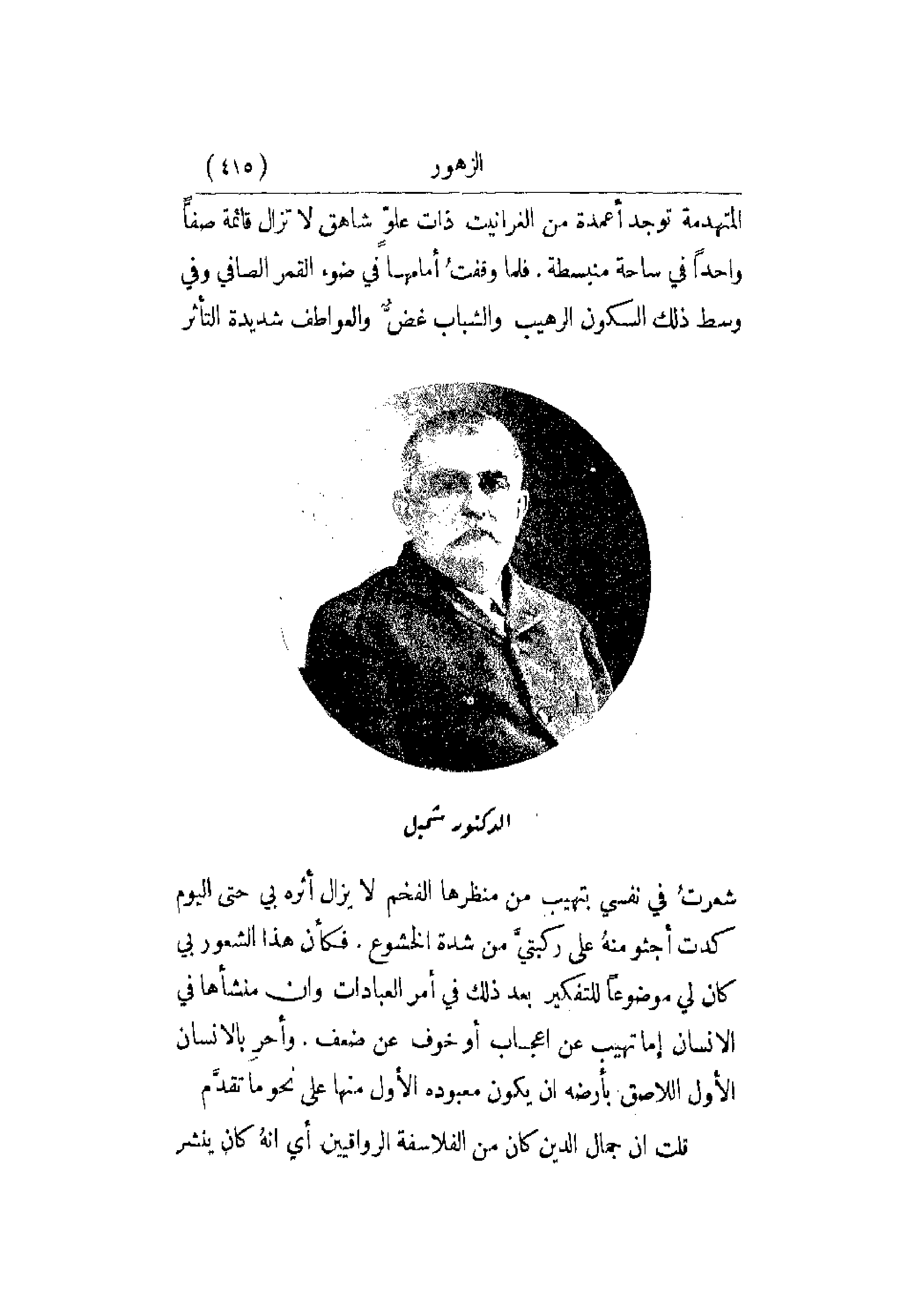 شدة الخشوع. فكأن هذا الشعور بي كان لي موضوعاً للتفكير بعد ذلك في أمر العبادات وإن منشأها في الإنسان إما تهيب عن إعجاب أو خوف عن ضعف. وأحرِ بالإنسان الأول اللاصق بأرضه أن يكون معبوده الأول منها على نحو ما تقدَّم. قلت أن جمال الدين كان من الفلاسفة الرواقيين أي أنهُ كان ينشر